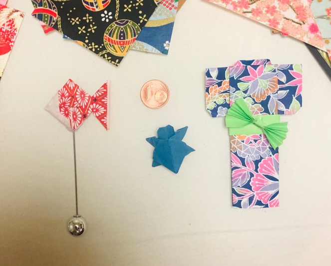 Just a peek at what I made tonight – I’ve jumped on the origami pin bandwagon. My pin origami figures use small paper, 6 cm square, which can result in figures about the size of a coin.