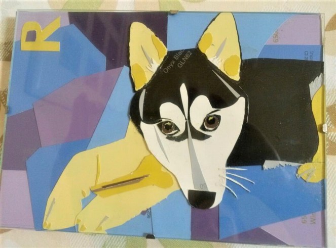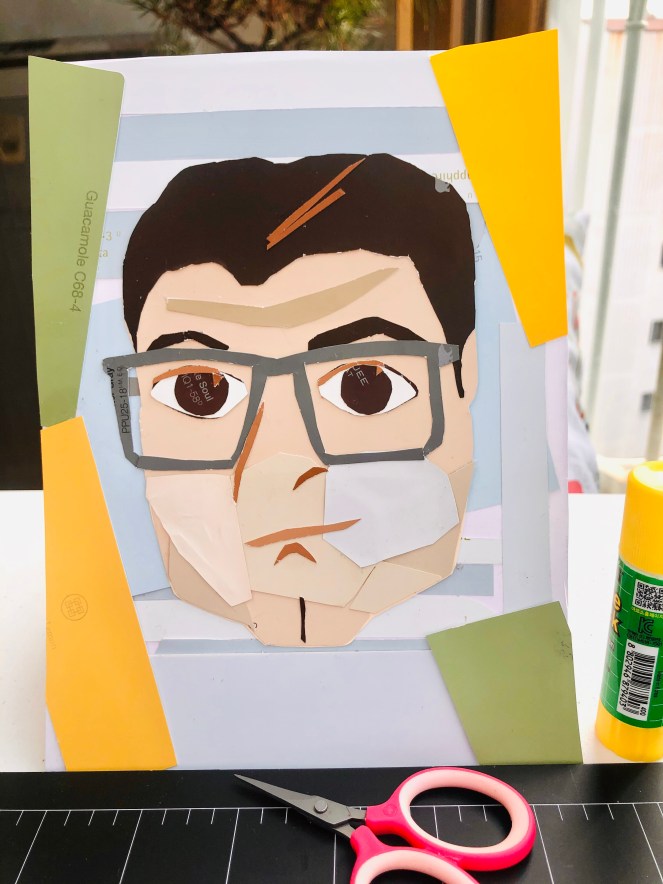 Sometimes I make portraits of people and animals from paint chips/samples. Yes, those free paint chip cards that you can pick up at a hardware/home improvement store. I cut the pieces freehand with a tiny pair of scissors, or occasionally I’ll bring in the “big gun” (an Exacto knife). They have a cartoonish aspect, I think.