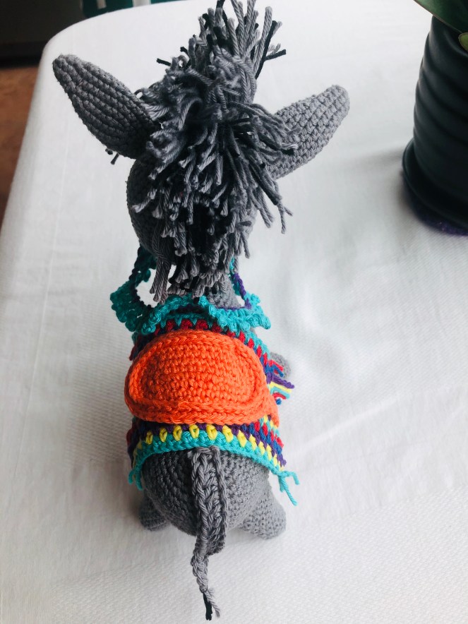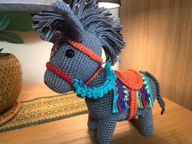Pedro the Donkey is far and away the most popular of my makes this year. He’s a pattern from Airali Design, using eight colors of “Phildar Coton 3” (a French brand of yarn). I started by making all his accessories, then the body, and finally the mane. I followed the pattern instructions exactly, with a few personal touches: Pedro has a little bell, and a salt-and-pepper mane. I also did the stitching on his rein a bit differently.