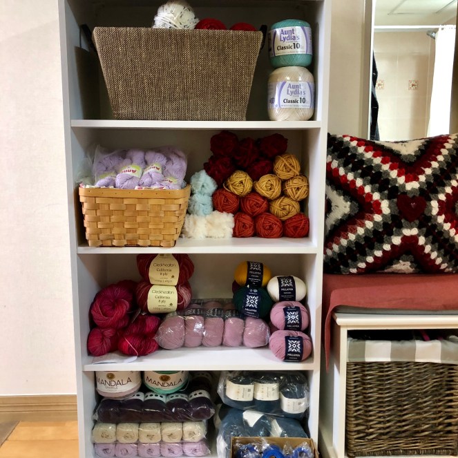 I’ve taken to stacking yarn in some shelving units in my hallway. The shelves flank a small bench that also has baskets underneath (for slippers).