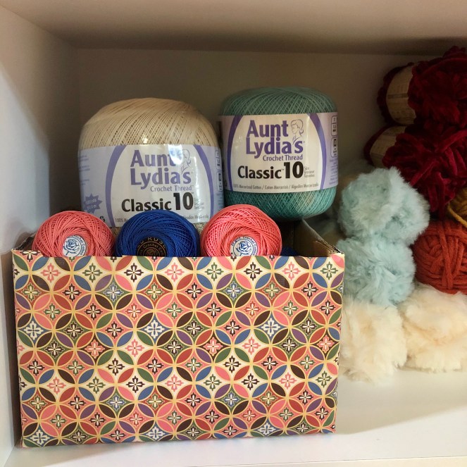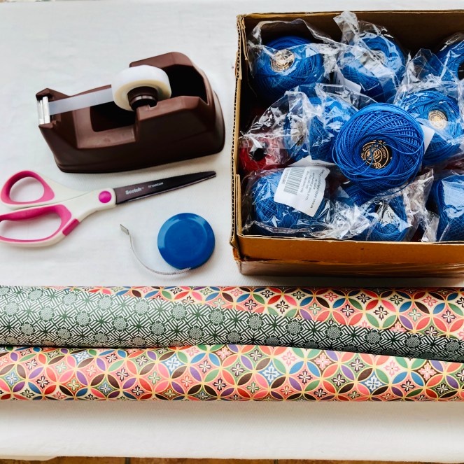 I am a big advocate of recycling, upcycling, and making life easier “on the cheap, ” but with style, bien sûr. If I have an unattractive box that happens to be a useful size, I’ve been known to break out the wrapping paper and dress it up. I did just that with a cardboard box that fits a special collection of crochet threads.