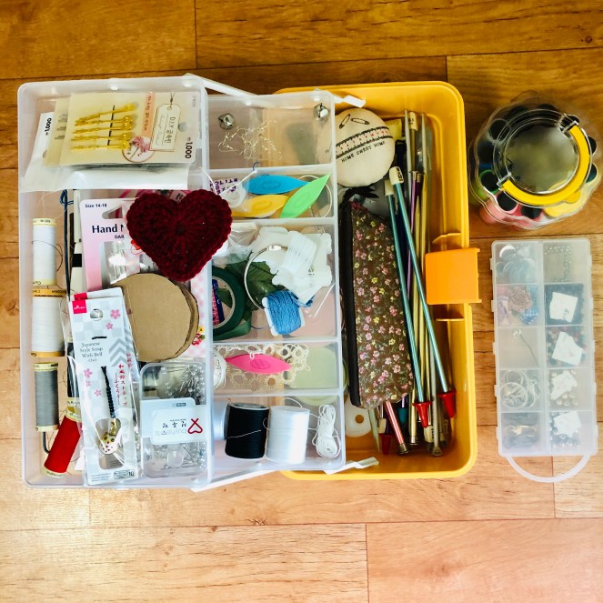 I’ve used fishing tackle boxes for years, to store my cosmetics, knitting needles and crochet hooks, beads, and sewing notions. If you look carefully in the box above, you can spot a few tatting shuttles and some abandoned tatting. I need to get back to tatting at some point soon. I really enjoyed learning that craft, which my great-grandmother practiced, and I fear is disappearing.