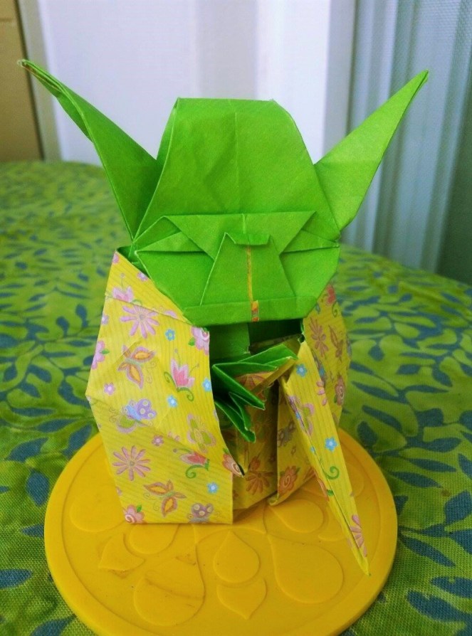 This figure of Yoda is one of my favorites, so I had to include it. I love Yoda for nostalgic reasons, but I also think Kawahata’s pattern is ingenious. My version uses a green floral paper, because it’s all I had at the time that was the proper size. The result is a little humorous and less austere than it probably should be; I call him my Primavera Yoda.