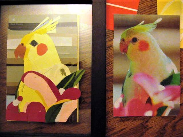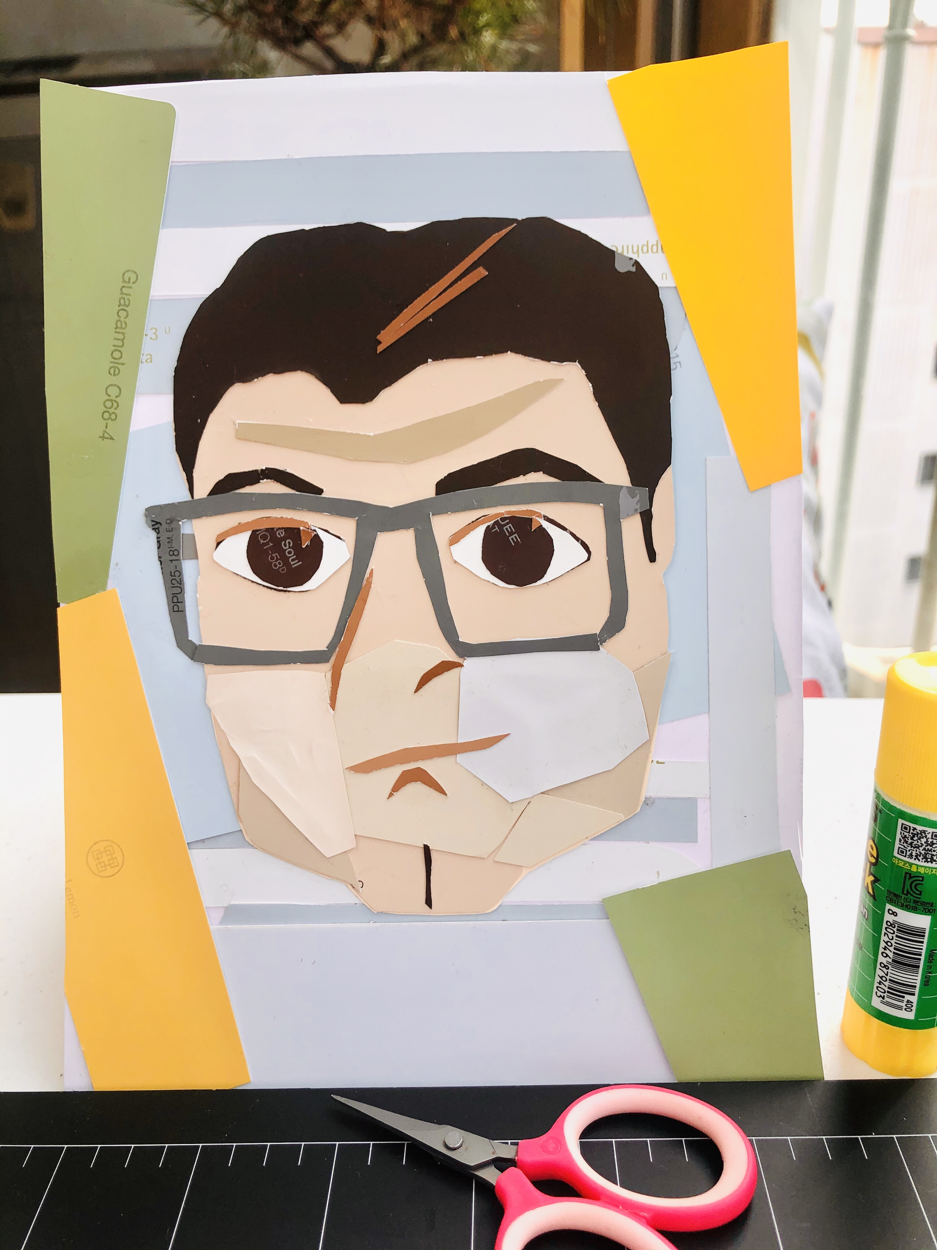 A few weeks ago, I blogged about my love of using paint samples to create mosaic portraits of animals and people. I’m not sure that “mosaic” is exactly the right term for what I do, because at least some of the elements of the pictures are literal (the eyes, for example).