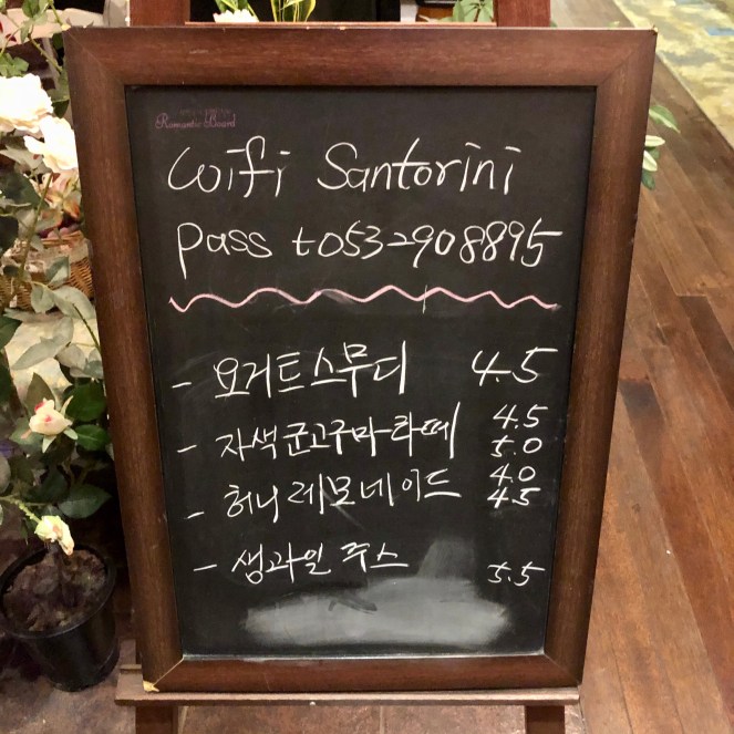 The menu is in Korean, but I’ve memorized it. Hand drip coffees, frappes, black and herbal teas, smoothies, and fresh pressed juices are the basic choices. They also have wine by the glass. Sweets are waffles, cheesecake, and toast with jam.