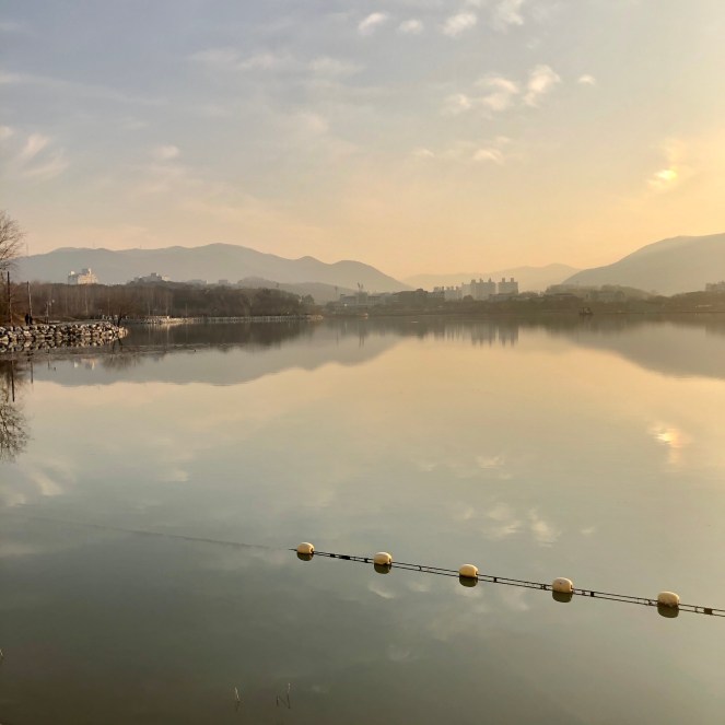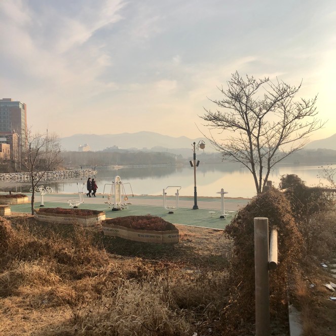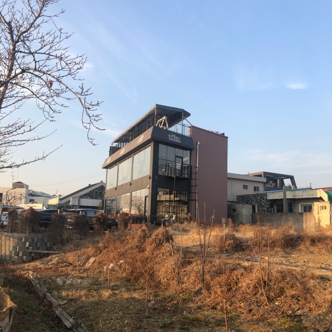 Another place I love that’s super close to home is Cafe Fond. This one is different – it’s a modern, chic, three-level “coffee condo” with a gorgeous view of the local lake. I say condo, because the decor at Cafe Fond is a bit “New York warehouse” with big windows to maximize the view. It’s interesting that such a contemporary place borders a little hamlet with several older buildings and a hanok (traditional house) or two.