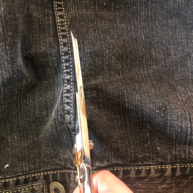 It took a couple of days to plan and finish the work. Before washing, I used fabric shears to carefully cut out the panels that I wanted. I had some fun “destroying” it, but still took care not to cut through a seam. After washing and drying it, I cut away all the frayed edges and ironed it.