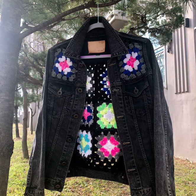 Last Saturday, I went to the thrift shops around my neighborhood’s traditional market, and found a couple of denim jackets that looked perfect for refashioning with crocheted granny square elements. They were only five dollars each, so I wasn’t afraid to do a little experimenting. One of them, pictured below, is faded black denim, which works nicely with some black, gray, white, and neon yarns that I had in my stash.