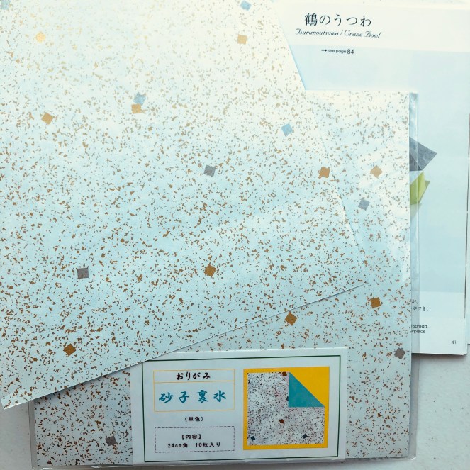 The crane box is the result of continuing the folds on a crane envelope, pictured above. It starts with a sheet of 24x24cm paper. I chose a paper that has color on one side, and a gold and silver-flecked design on the other, because both sides can be seen in each of the models. It could also be made in a single color or white+color and I think look very elegant.