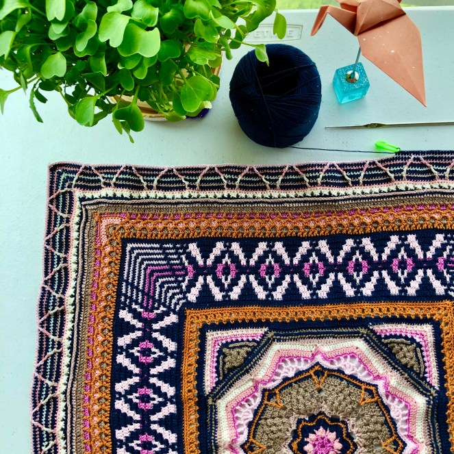 Just a quick check-in today – I have made a little more headway on the Spice Market pattern. The lantern-like motif in Part 7 is coming through. I love the variety of stitches in this design, and the overlay/stripes is a fun section. The best news, I am almost done with this beauty! So anxious to enjoy in its entirety, and finally move on to another challenge.