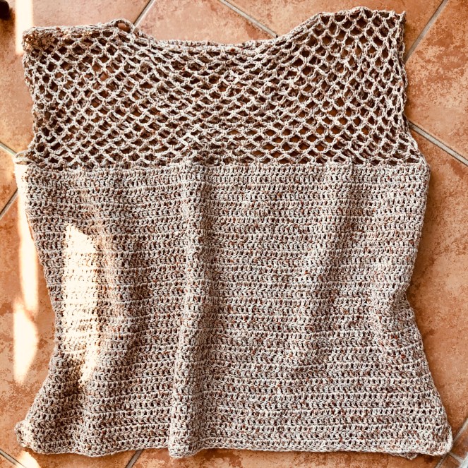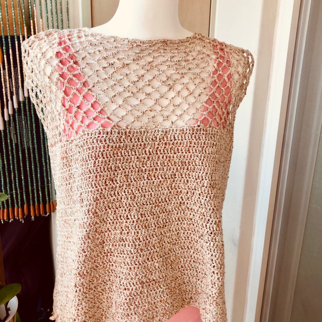 The measurements are just right for me, but I think I went overboard with the net. If I were to make it again, I’d lift the net up by a couple of rows, and add some subtle decreases at the waist. I love the feel of the yarn and I will definitely wear it with a contrasting t-shirt or tank top underneath. If I were to make it again, I’d also try with a different yarn I found that has tiny sequins – I’ll update soon about it.