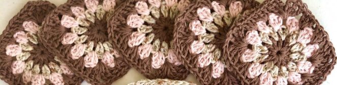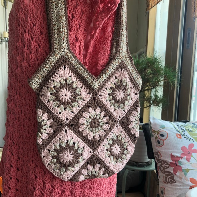 I just finished this little granny square bag, using some leftover Phildar “Shiny” yarn from my summer top, as well as some brown and pink cotton that I had in my stash, found during a yarn shopping trip in Fukuoka three years ago. All the cottons together make for a sturdy yet supple bag.