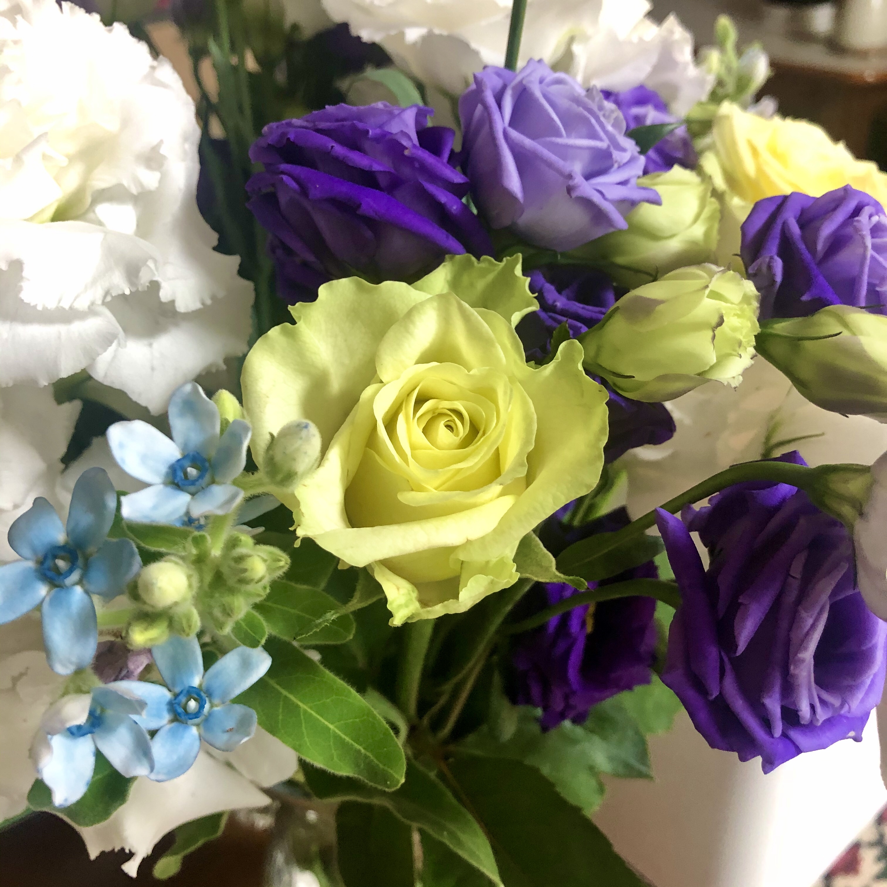 Bunches of roses, forget-me-nots, and ranunculus dress the table. There will also be champagne today.