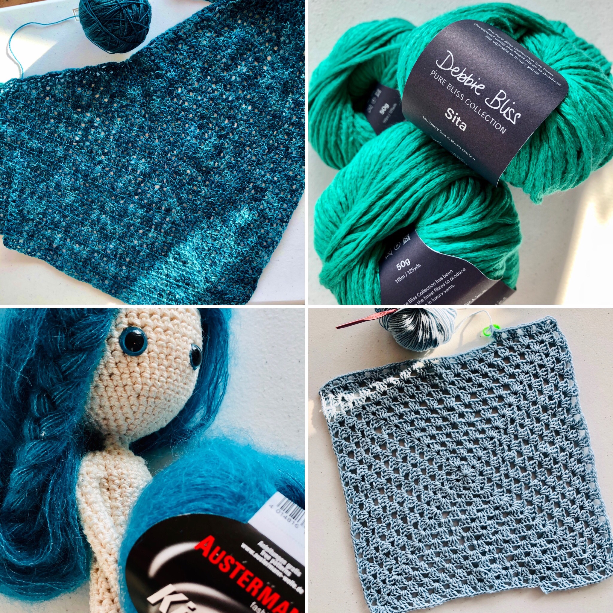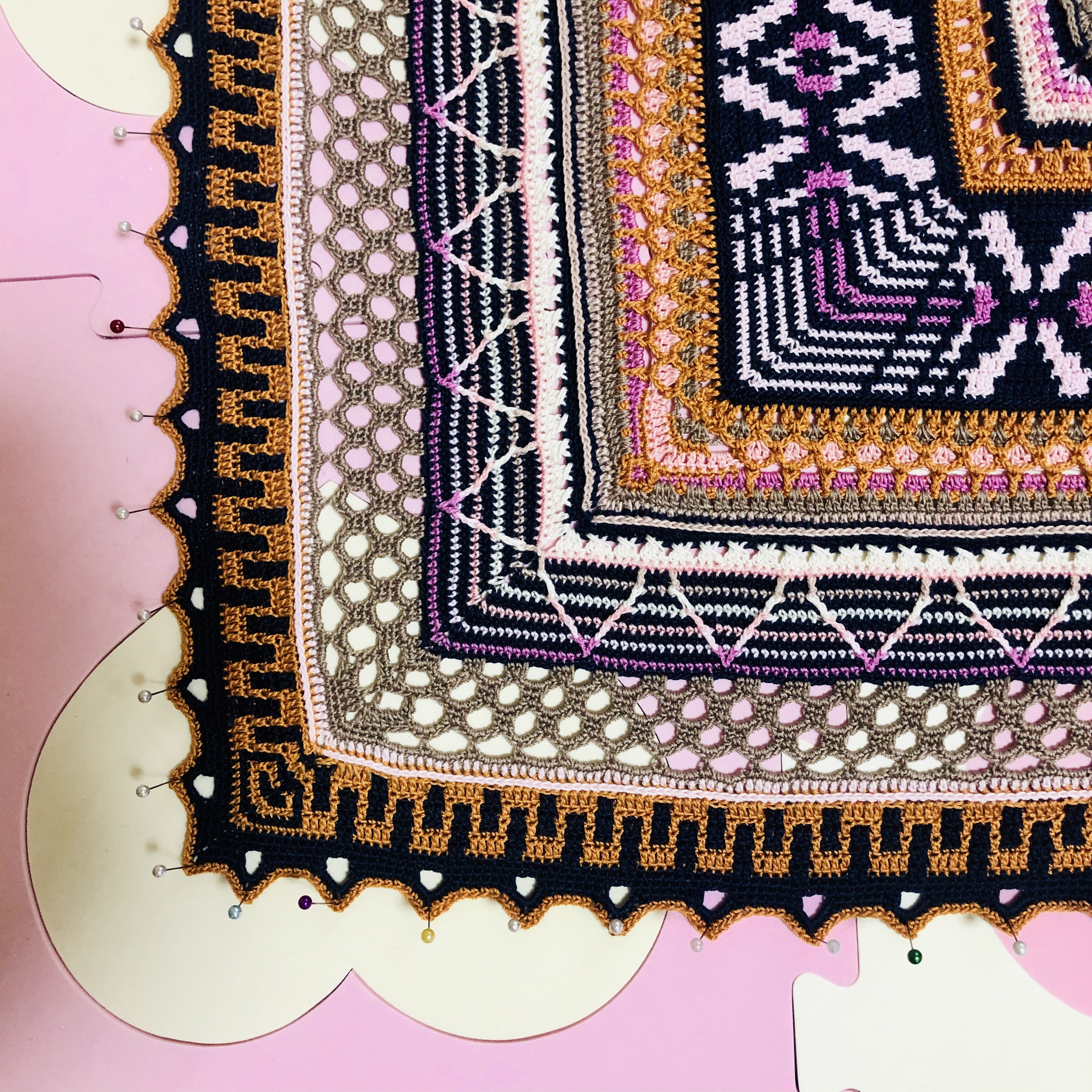 I’m working on a number of crafty projects, including finally finishing the mermaid’s hair (the yarn finally arrived, yay!), the border to the Tramonto shawl (photos in my next post), and a big granny square shrug. I bought some wonderful sea-green silk blend yarn for another garment. The Spice Market mandala blocked beautifully, and I think it will be fine as a wall hanging.
