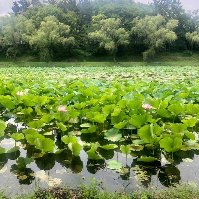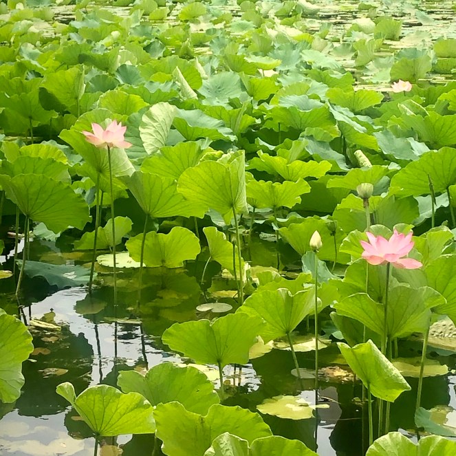 Bo and I took a big forest walk after I got back, and stopped at the big lotus pond on campus to eat lunch beside it. The pink lotus that come up during mid-summer have massive blooms, and the leaves are bigger than a person’s head. The plants engulf almost the entire pond, and dragonflies are darting among the foliage with their translucent wings. The landscape is extraordinary to compare with winter. You can see the difference back in one of my January posts.