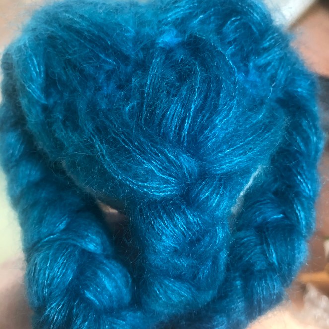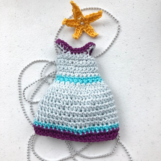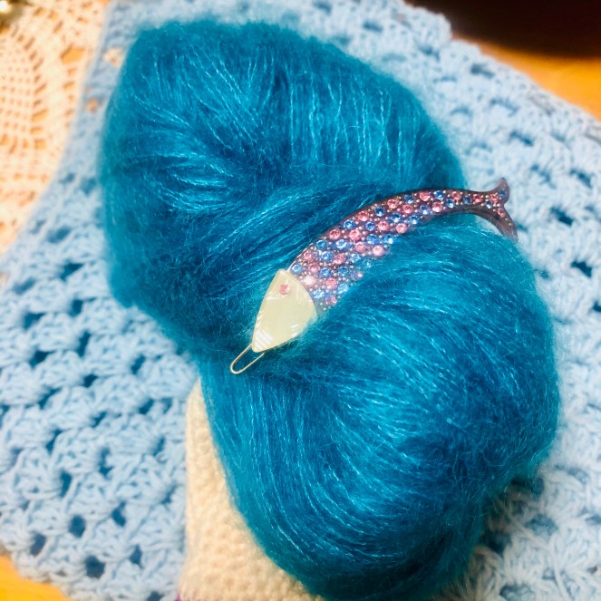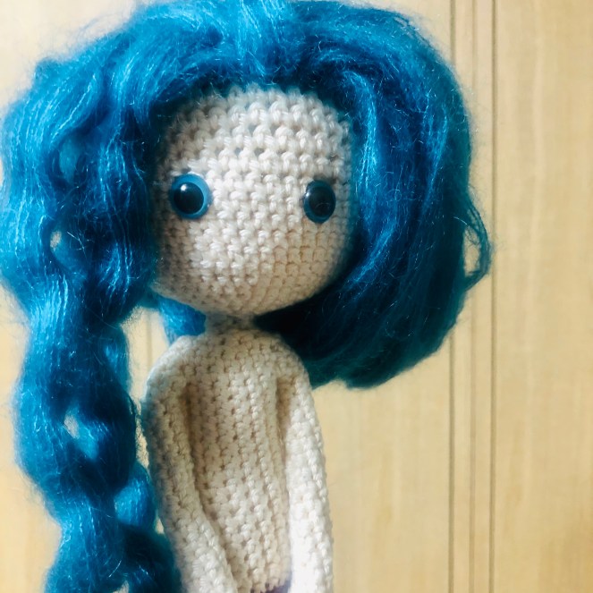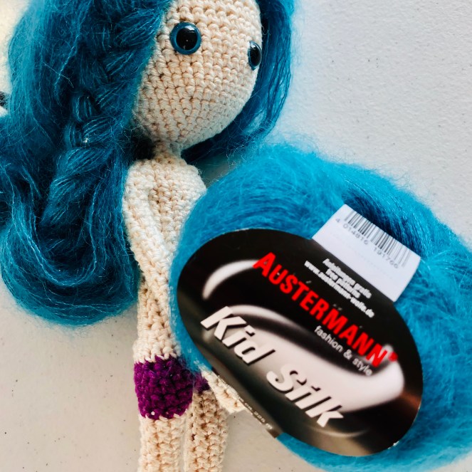 Ava’s body, dress, and fishtail are crocheted with 3.25mm hook and Phildar Coton 3, my favorite amigurumi yarn. The yarn has a pleasing stitch definition and very subtle sheen. Her hair is Austermann Kid Silk, a beautiful mohair/silk blend with a halo. It was a little challenging to control her hair, since it’s so densely woven in. Braiding it tightly and leaving it for a couple of days, then releasing it, calmed it down a lot. Then I tried a couple of up-do’s and pigtails, tying it up with some of my own hair clips.