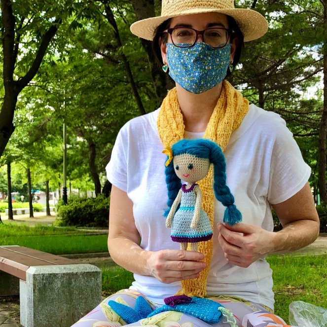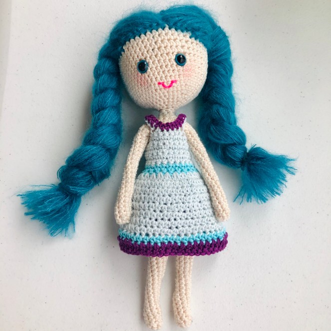 Her face is simply created with blue safety eyes, a small embroidered mouth, and a bit of blush at the cheeks. The body is reinforced with 2mm wire and poly fill.