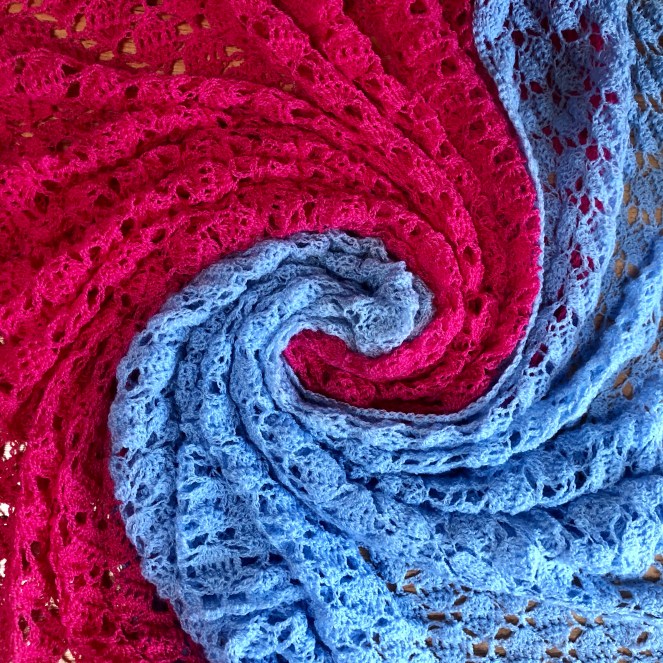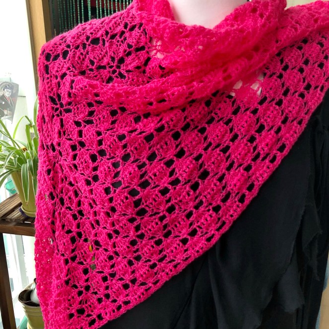 Just popping in to show my latest finished object, a hot pink shawl crocheted of 2-ply merino. I made a periwinkle one just like it a few weeks ago.