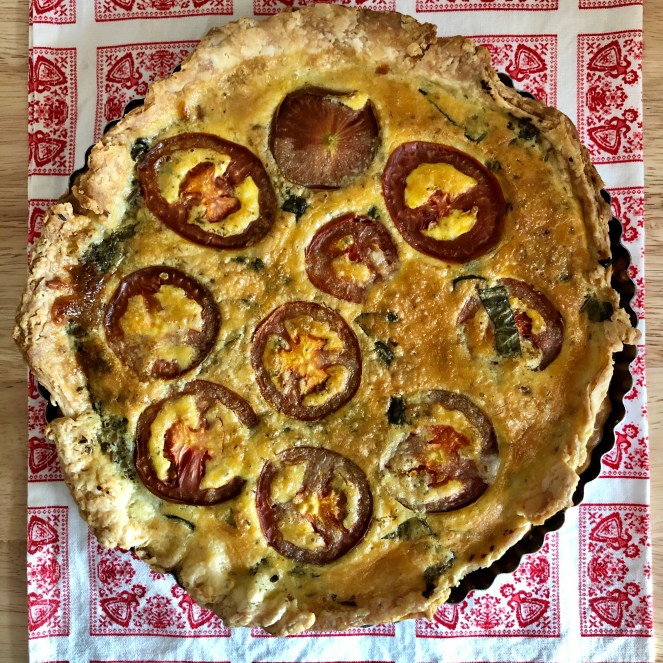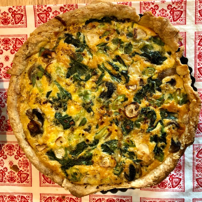 After I par-baked these two, I brushed both bottom crusts with pesto, then for the one on the left, I added a custard filling with mozzarella, tomato, and fresh oregano and basil. The one on the right got some pre-cooked spinach, leeks, mushrooms, garlic, cheese, and the egg custard. Baking the filled tarts for about 35 minutes was plenty of time to set them and fill my kitchen with a delicious aroma.