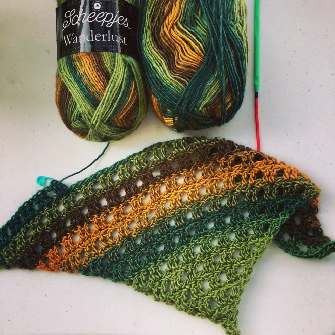 I’ve brought the autumn colors inside, too, with my ongoing projects. I’m about half-way through the Wanderlust shawl. The yarn is a treat to work with – it’s 100% acrylic, very soft, and has a subtle halo. I’m well on my way to using 3 skeins, and I am pretty sure now that I will edge it in brown, and add some tassels.