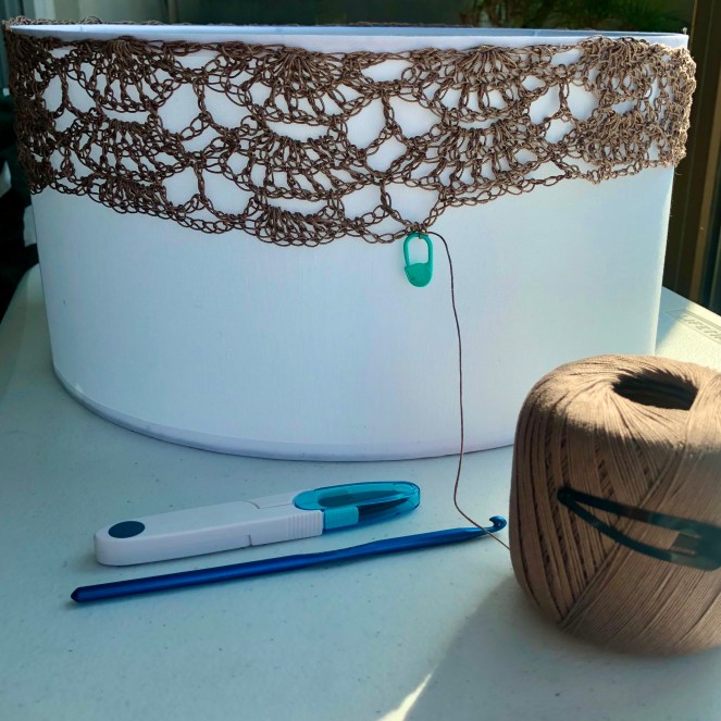 I’m using another Scheepjes yarn, Sugar Rush in Moon Rock (a medium taupe), to create a lampshade skirt for a drum shade in my living room. This shade so happens to exactly match the chair next to the lamp, and if you remember the Spice Market mandala, this is one of the yarns I used for it – I had more than a ball left, plenty to make this shade cover. In the left photo, you can see I am almost finished. The final touch will be fire-polished glass beads, coming in the mail this week from the Czech Republic. I’m so grateful that I am still able to order supplies form around the world to support my hobbies.