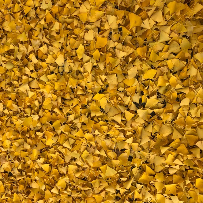 Just want to share a few shots of Autumn colors in my neighborhood. I’ve been wearing the new tasseled shawl that I told you about in my previous post. It’s so roomy and cozy. The gingko trees have all turned gold and mostly dropped their leaves now (they are always the quickest to shed their leaves, whereas the maples take their time). The weather these last few weeks has been fine indeed and I’m enjoying as much outside time as possible with Bo before the chill really sets in.