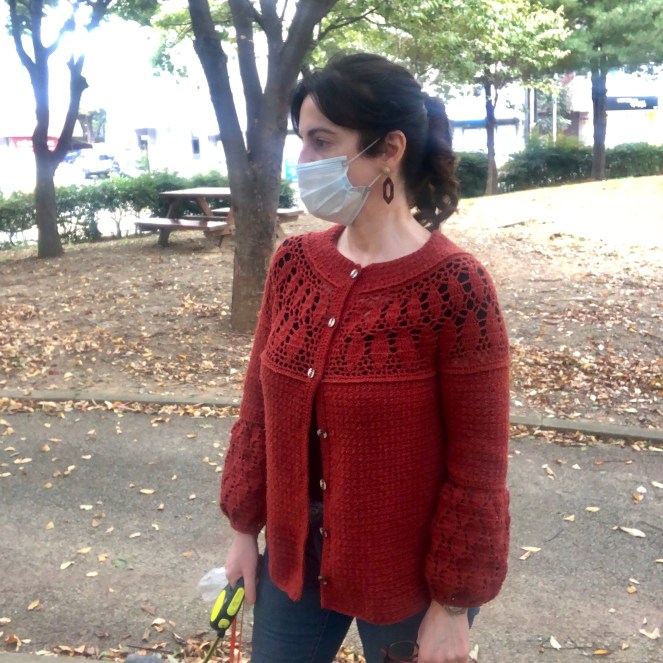 The Metropolis cardi was not the first cardigan I have made, but it was fun to make, and I got to try one with buttons for the first time. In fact, looking for buttons was one of my favorite steps in making this garment. If I were to make it again, I might use a different yarn that pills a bit less. I really do love the color, though, and it has such distinctive balloon sleeves in my rendition. The pattern also has a straight-sleeve option.