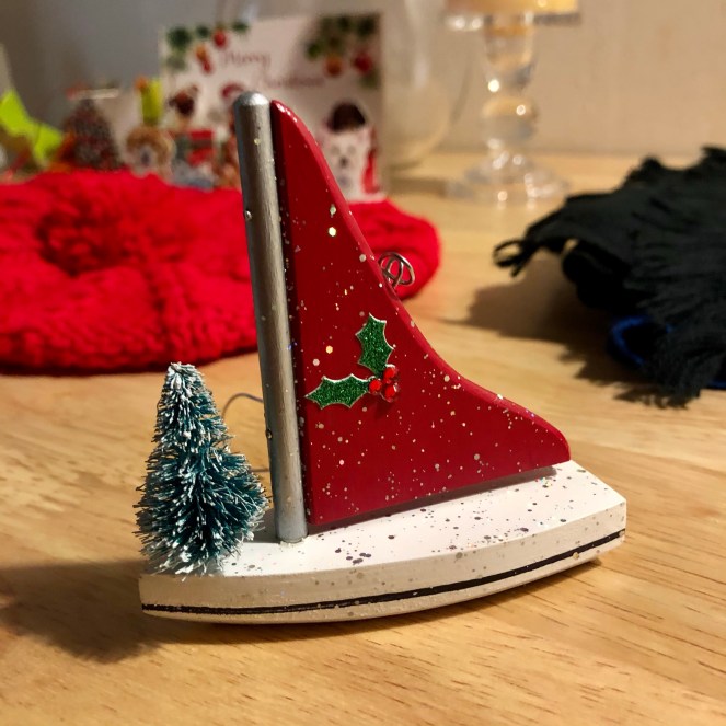 Well, yesterday I received a wonderful and highly anticipated Christmas care package from home (California) that took an unexpected seven weeks to arrive – after Christmas, but of course it is no one’s fault, just another pandemic glitch. Dad’s yearly Christmas ornament was inside. This year he has created an adorable sailboat with a red mainsail and a Christmas tree perched at the bow.