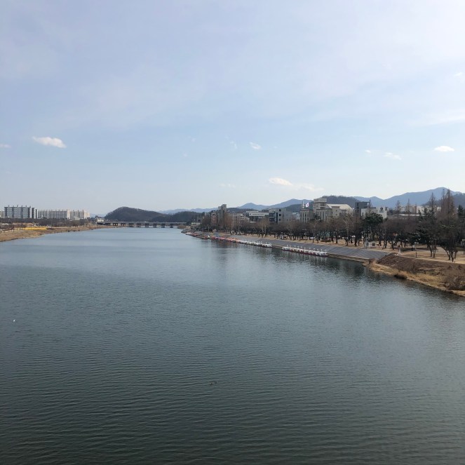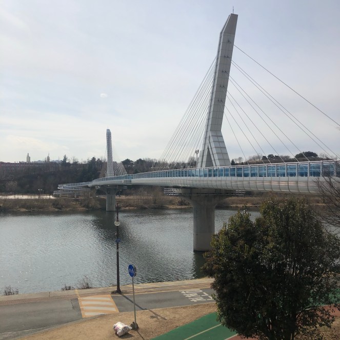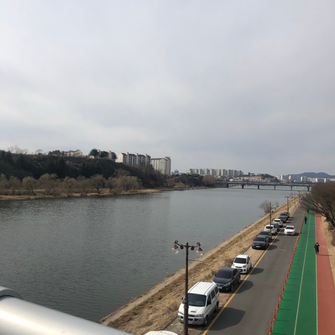 The bridge is a popular spot to watch the sun rise on New Year’s Day, as well as to view the cherry blossom time in April. Our weather this winter has been unseasonably warm, so we may indeed have an early bloom; I’ll be sure to come here to enjoy it. The view of the river is peaceful, and I spotted some familiar avian friends, including a solitary seagull that surprised me — Daegu is not particularly close to the sea. This guy might have been lured out by fish in the river. I also saw ducks and coots that I’ve seen at my neighborhood pond and written about here.