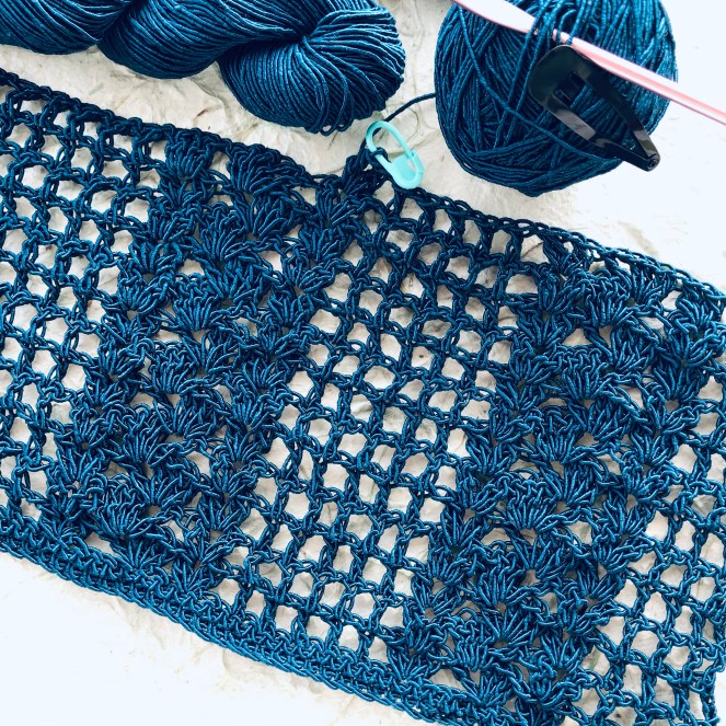 I’ve had this yarn for quite some time, and realized recently that it is now discontinued. I’m so glad I bought a big quantity before it disappeared. I also have 2 hanks of pink that are earmarked for a cowl. The work is moving fast, with lots of net and offset shells so far. The piece is acquiring a nice weight and silky texture. I’m using a 3.75mm hook.