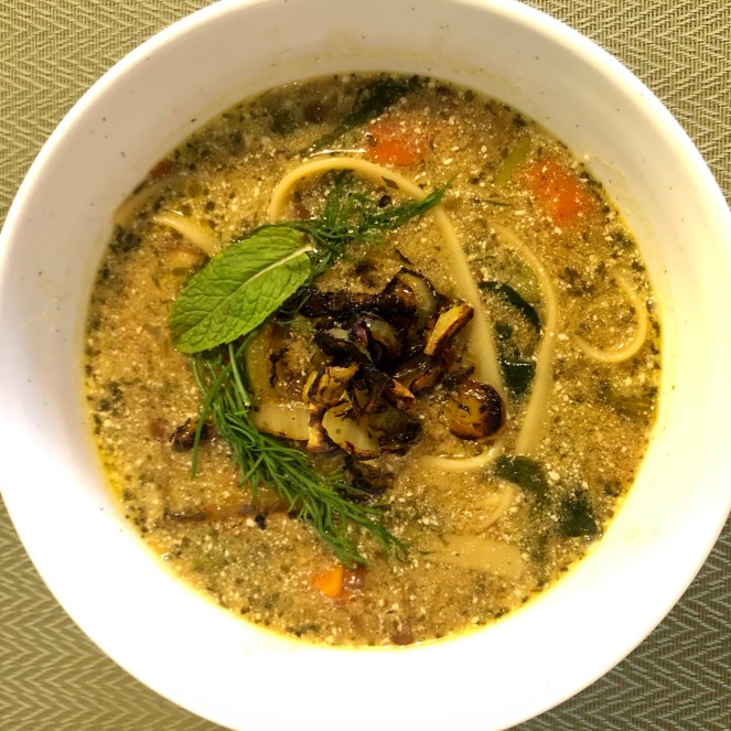 Here I share a few photos of some of the raw ingredients – onion, garlic, herbs, beans and lentils – and the finished product. I did substitute a carrot for the beet, since I couldn’t find one. I think beets are out of season now in Korea, and they are somewhat rare, in any case. I also made my own lovely stock, from lamb bones I had saved from Easter. There’s no meat in this soup, though.