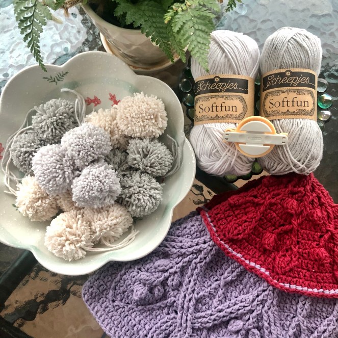 Speaking of other projects, I am also about to finish up the second Sakura mandala, which will become a 50″ round pillow cover. It will be somewhat bigger than I thought it would – big enough to use as a floor cushion for a person. I’m making 24 pompoms to go around it, using Scheepjes Softfun and one of my favorite crafting gadgets, a pompom maker by Clover.