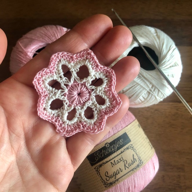 I can drag my heels when it comes to finishing old projects, but I have no problem starting new ones. Yesterday I just began another flower motif project – a belt with connected segments. This one calls for cotton thread and a 1.90mm hook. And why not use pink and white! (It’s actually leftover Scheepjes yarn from my Spice Market mandala).