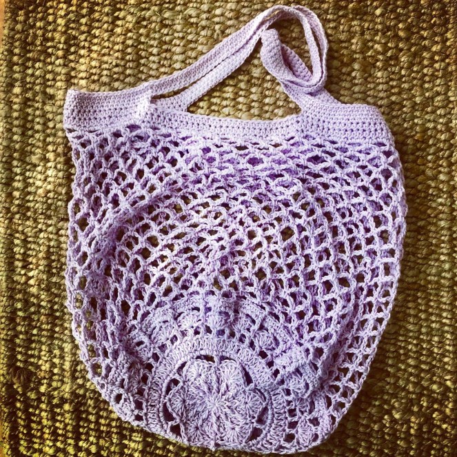To bridge between projects, I needed something fun, summery, and easy, so I found this gorgeous little cotton market bag pattern on LoveCrafts. You can also find the pattern link on Ravelry. It takes no time at all to work up, and the center motif would be cute all by itself, as a coaster or embellishment. The photo shows two colors of Paintbox cotton DK, in Dusty Rose and Dark Aubergine. However, any cotton DK yarn would do for this bag. It took me a bit more yarn than the pattern stated; I used about 120 grams for the work.
