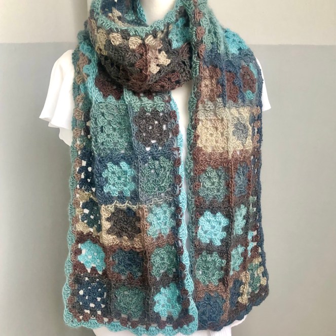 The finishing touches have been added to my granny square scarf, a free pattern by Wool Thread Paint, made with King Cole Riot yarn in shade “Waterways.”