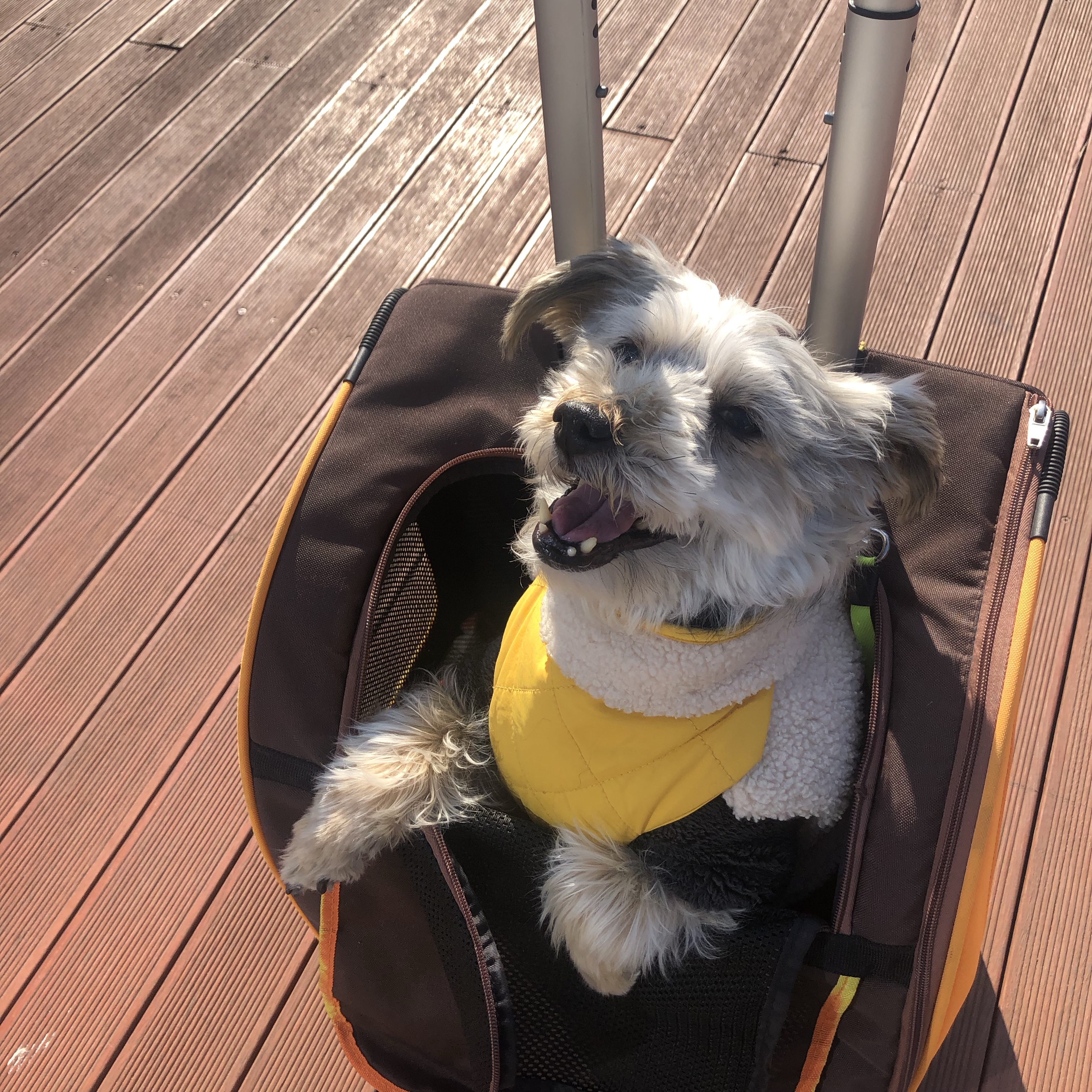 Thanks for your kind words! Yes, that is a little wheeled carrier for my dog. After just a bit of training, he’s comfortable in it zipped up and rolling. In winter, I put a small heated pouch and a blanket inside so he’s cozy.