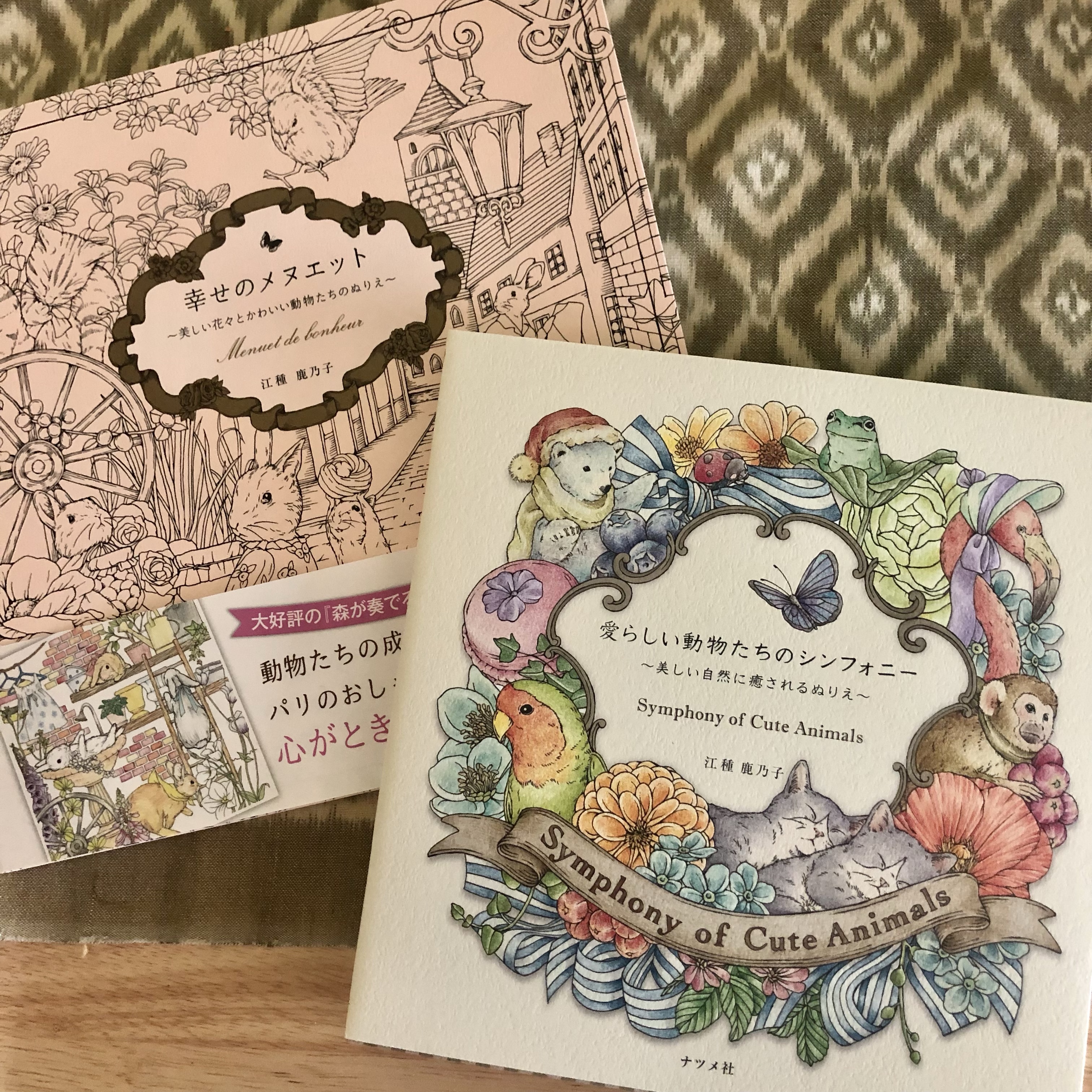Lastly, here’s a peek at two more Kanoko Egusa coloring books that arrived from the Etsy seller Pomadour’s Craft Cafe (I wrote about one book in my previous post). Here, I share two more – one is Symphony of Cute Animals, and the other is Menuet de Bonheur (Minuet of happiness). These are such charming coloring books, and arguably best suited to an older fan of coloring, since they are detailed, and have themes that are linked throughout the pages. Probably colored pencils will be best to tackle these, as the images are printed on both sides of the page.
