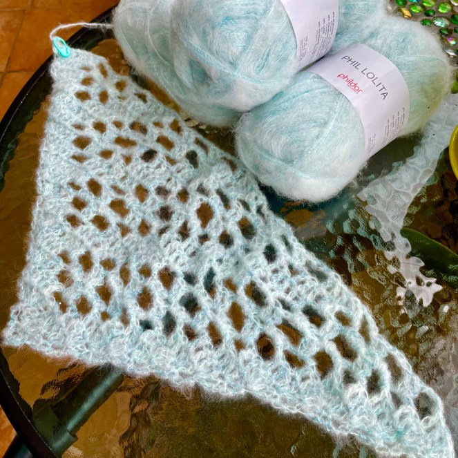 I’m also starting a new openwork shawl, with a pattern by the talented Sylwia at My Crochetory. The yarn I choose is Phil Lolita, a 10/90 wool/acrylic French brand that has the feel of a mohair blend. In fact I bought the yarn first, before deciding what to do with it. This yarn is an ethereal blue, and along with its airiness and the open-weave pattern, should result in a cotton candy confection of a garment.