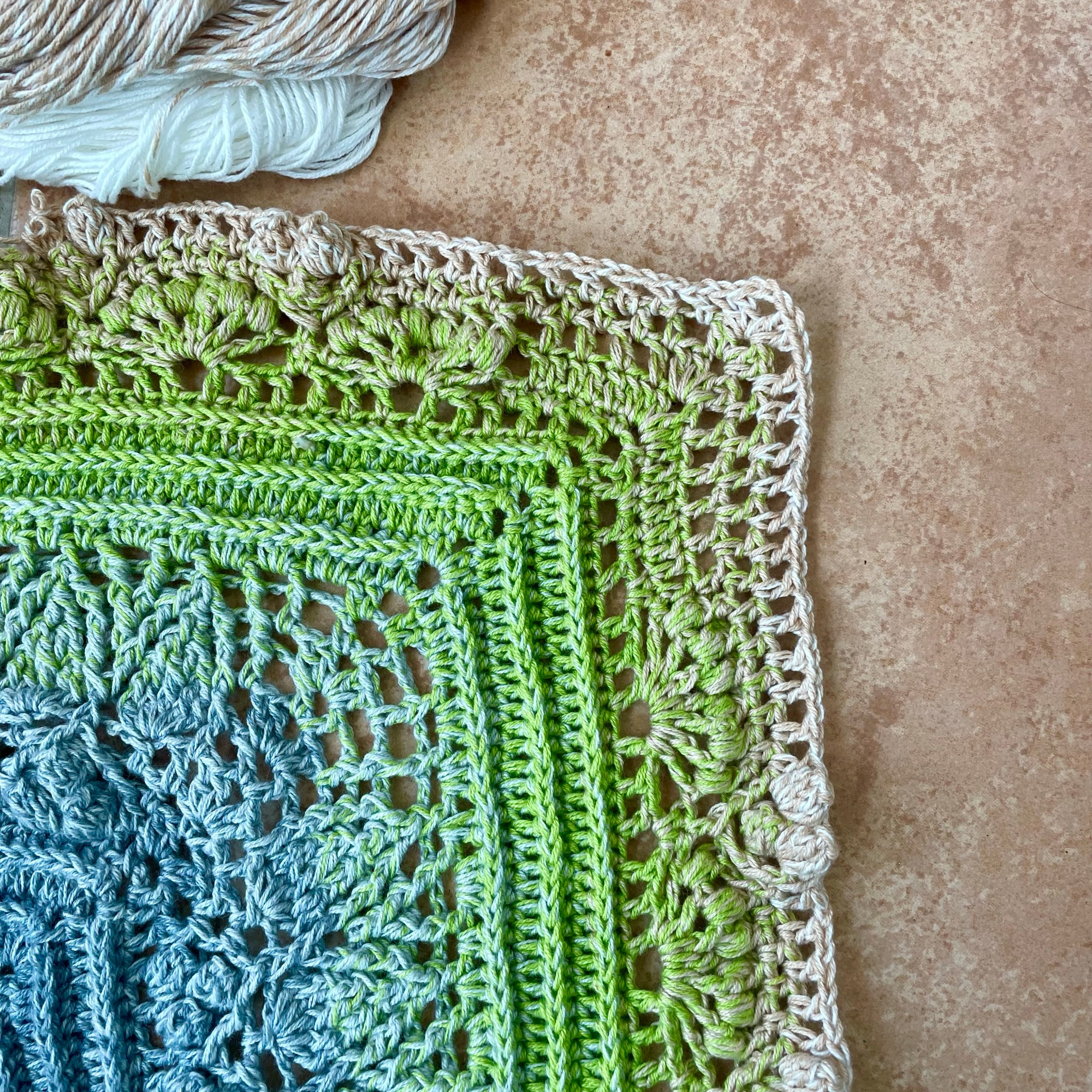 The “New Life” mandala is done, just in time for Spring. This is a lovely pattern by The Guy With the Hook, designed to use an entire 1000m gradient yarn cake. I made mine with YarnArt Flowers and a 3.00mm hook. It is just big enough to trim my kitchen table (below, you can see it in the sunlight on my patio table).