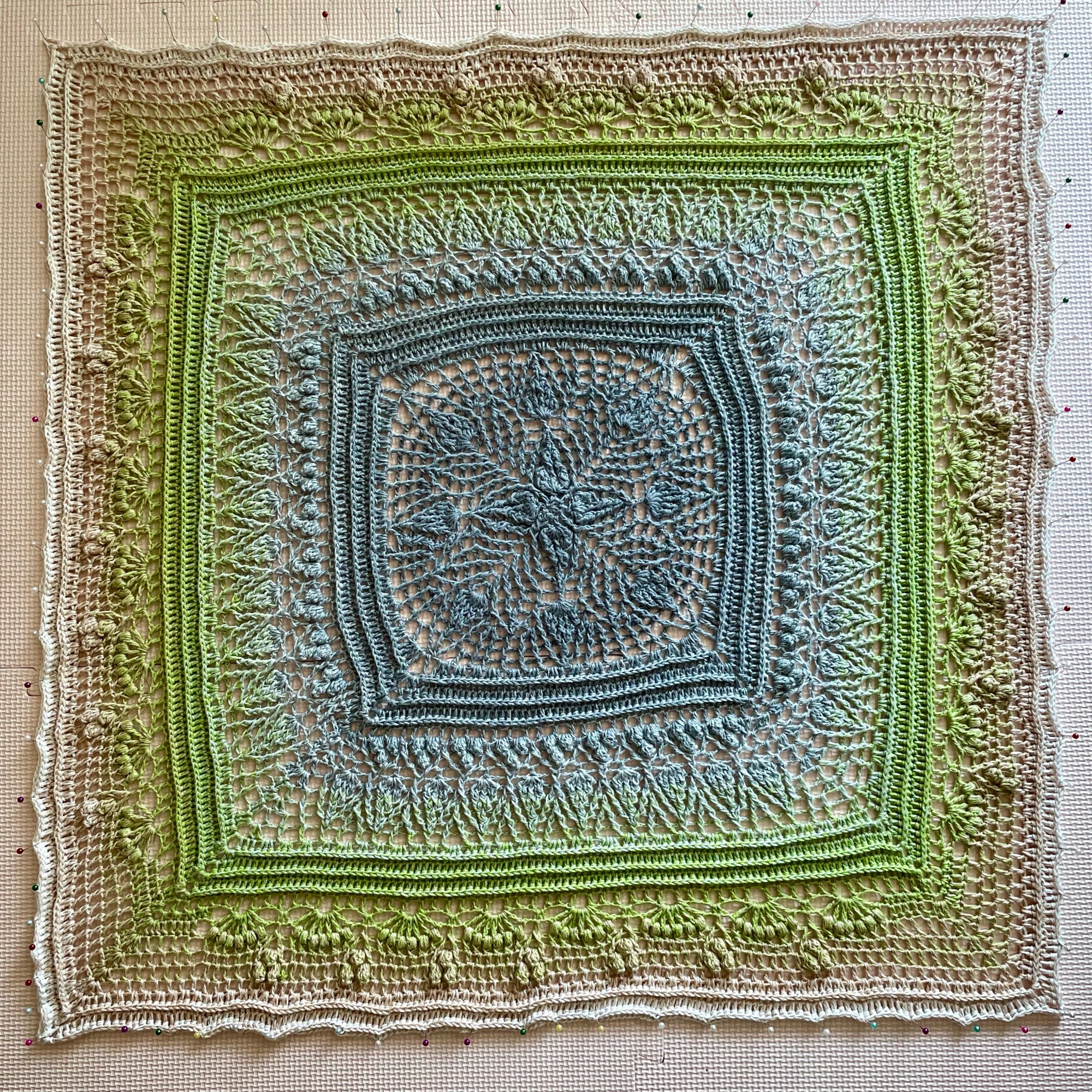 To adjust the stitches after finishing, I blocked the piece on a child’s play mat using pearl head pins, then sprayed it lightly with lavender water and let it dry overnight. The finished size is about 70cm square. I will try to make a short video of this piece so the stiches and colors can be better seen.