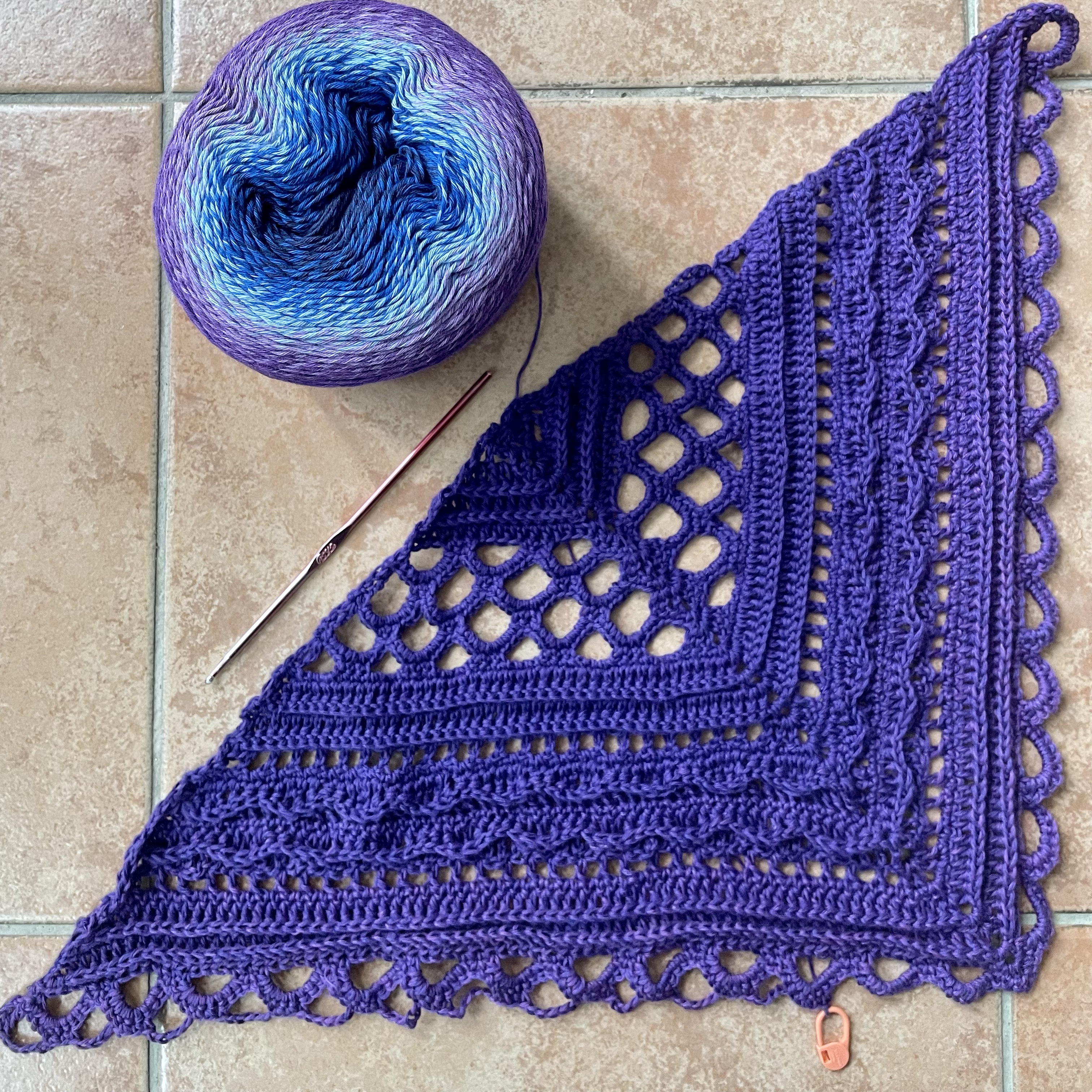 The other WIP I’m sharing is a shawl called Soul of the Sea, a pattern by Mark at The Guy with the Hook. This one uses an entire Scheepjes Whirl and a 3.5mm hook. My color choice is 782 Brambleberry, a mix of vibrant blues and purples.