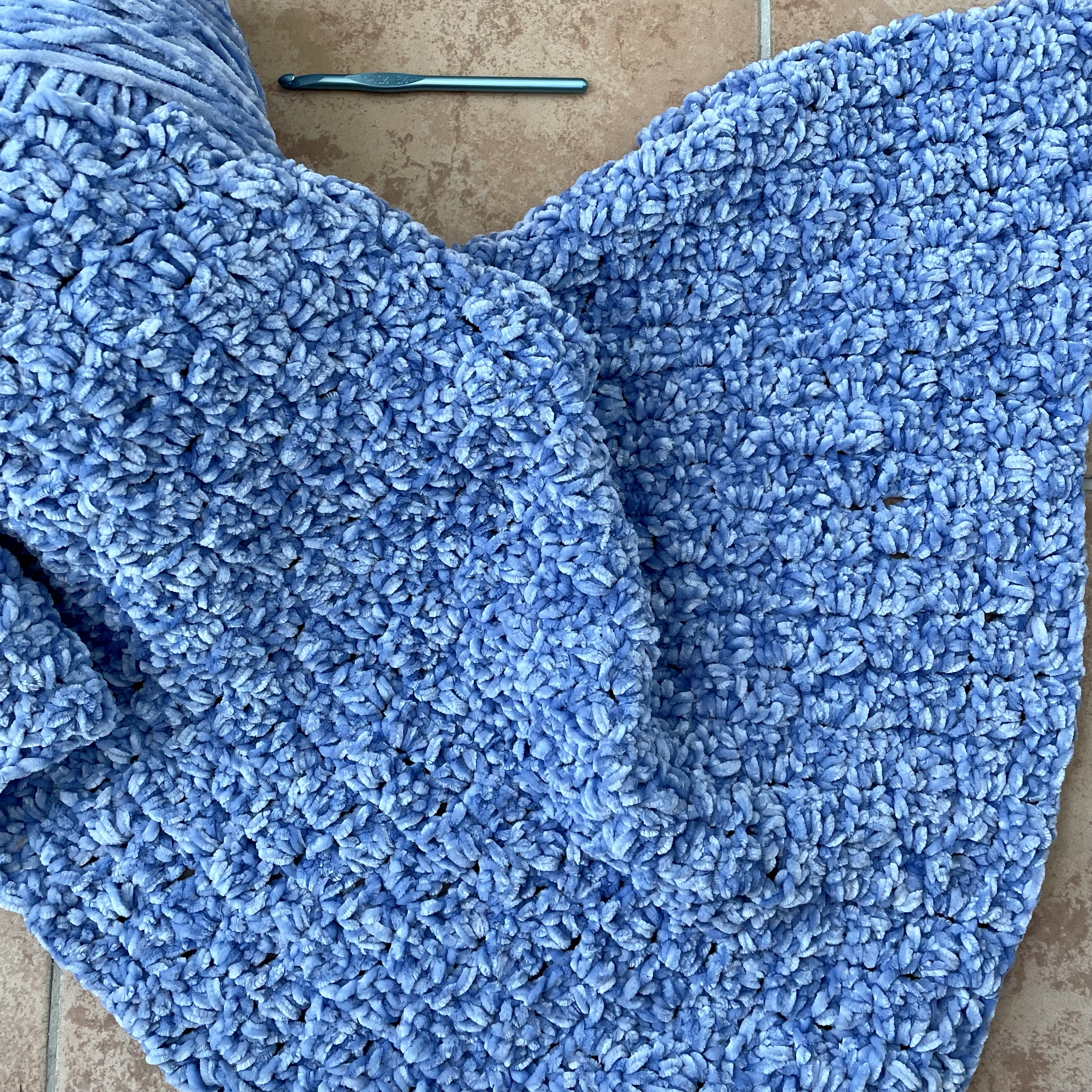 I hope this finds you well. Checking in with a couple of my current crochet doings. The first is a wonderful baby blanket that uses a traditional corner-to-corner technique, and Bernat Velvet yarn in color Smokey Blue. I love this shade of blue – it’s almost periwinkle. The finished article will be for a special lady I work with who is expecting soon.