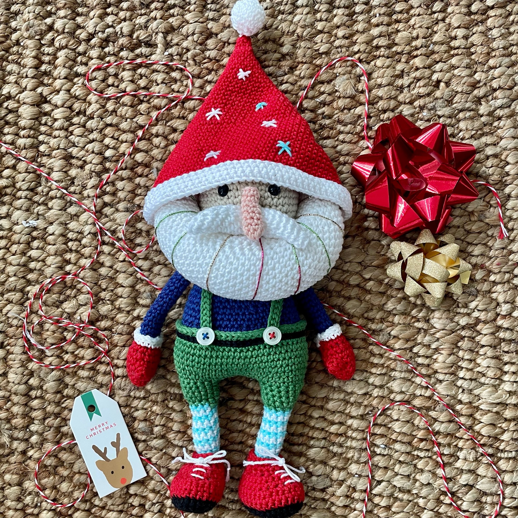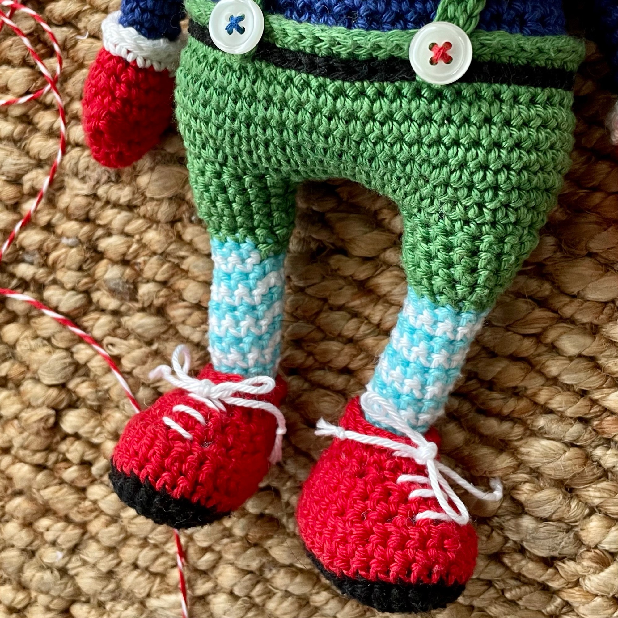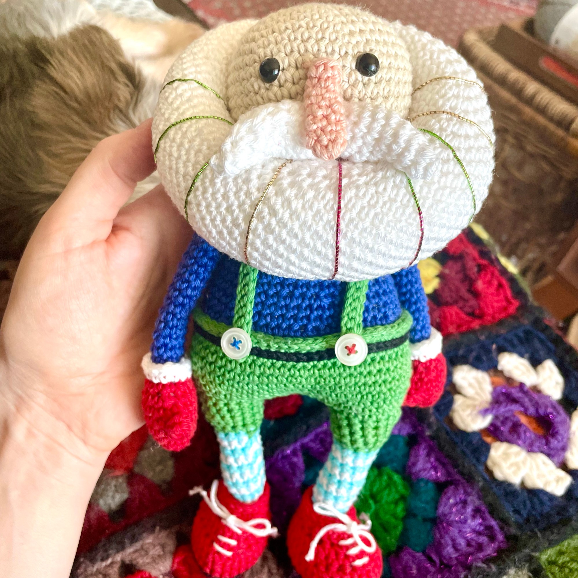 It took me about 10 days to complete him, working a little bit each day. I used 100% mercerized cotton yarns – Phil Coton 3 and Schachenmayr Catania, two of my favorite ami yarns that work well together. I love to use mercerized cotton in my amigurumi, as it results in a smooth, slightly glossy finish. I used a 3.25 mm hook; if you try this pattern, you can experiment with hook sizes and even go down to 3.00 mm. I recommend the tightest stitches you can do comfortably. The beard decoration uses a metallic cord brand called Saipan, but similar material could be found in well-stocked craft stores. Buttons are sewn on with basic poly thread. I used 8mm safety eyes. He measures 33cm / 13 inches from pompom to shoes.