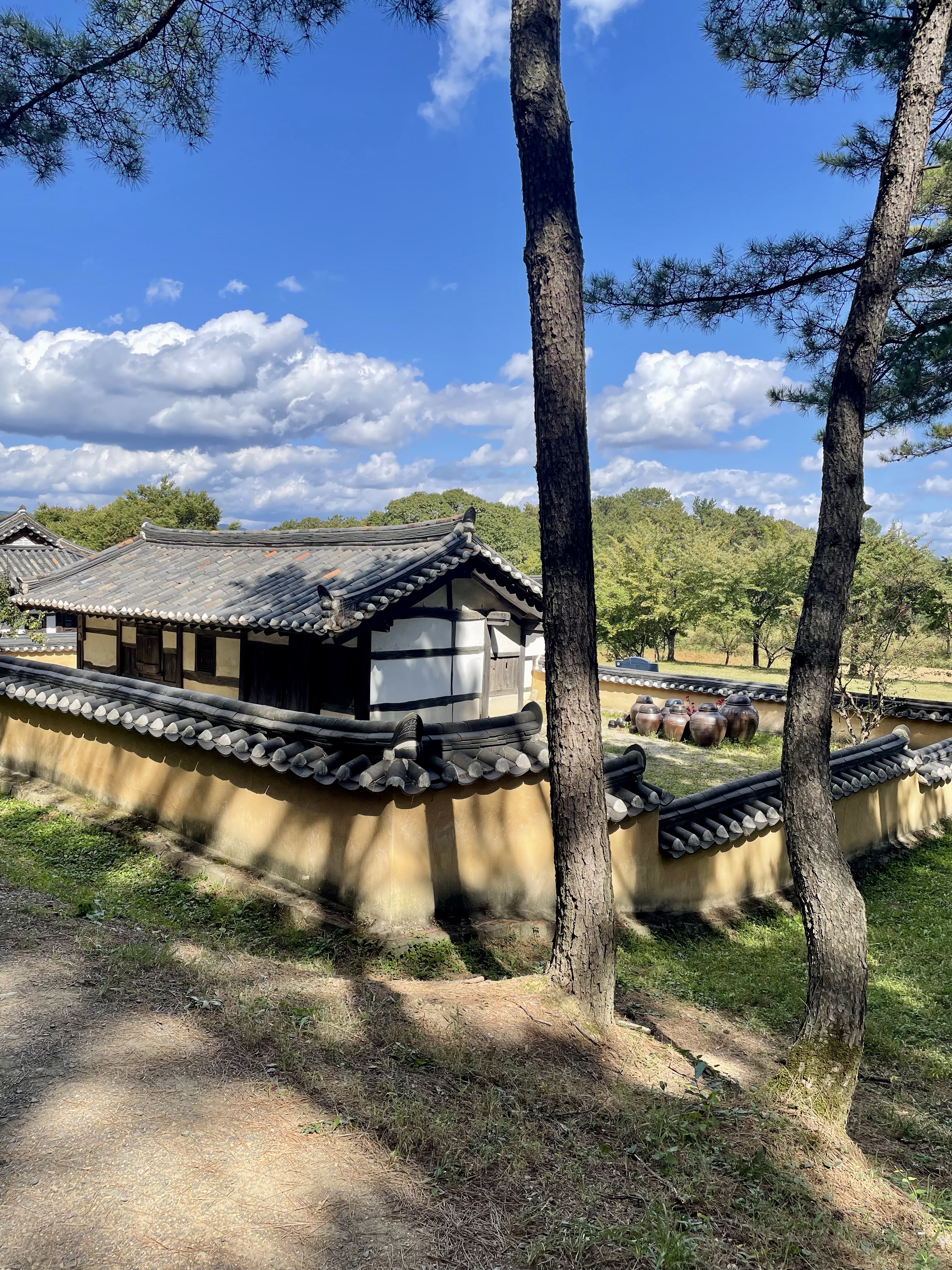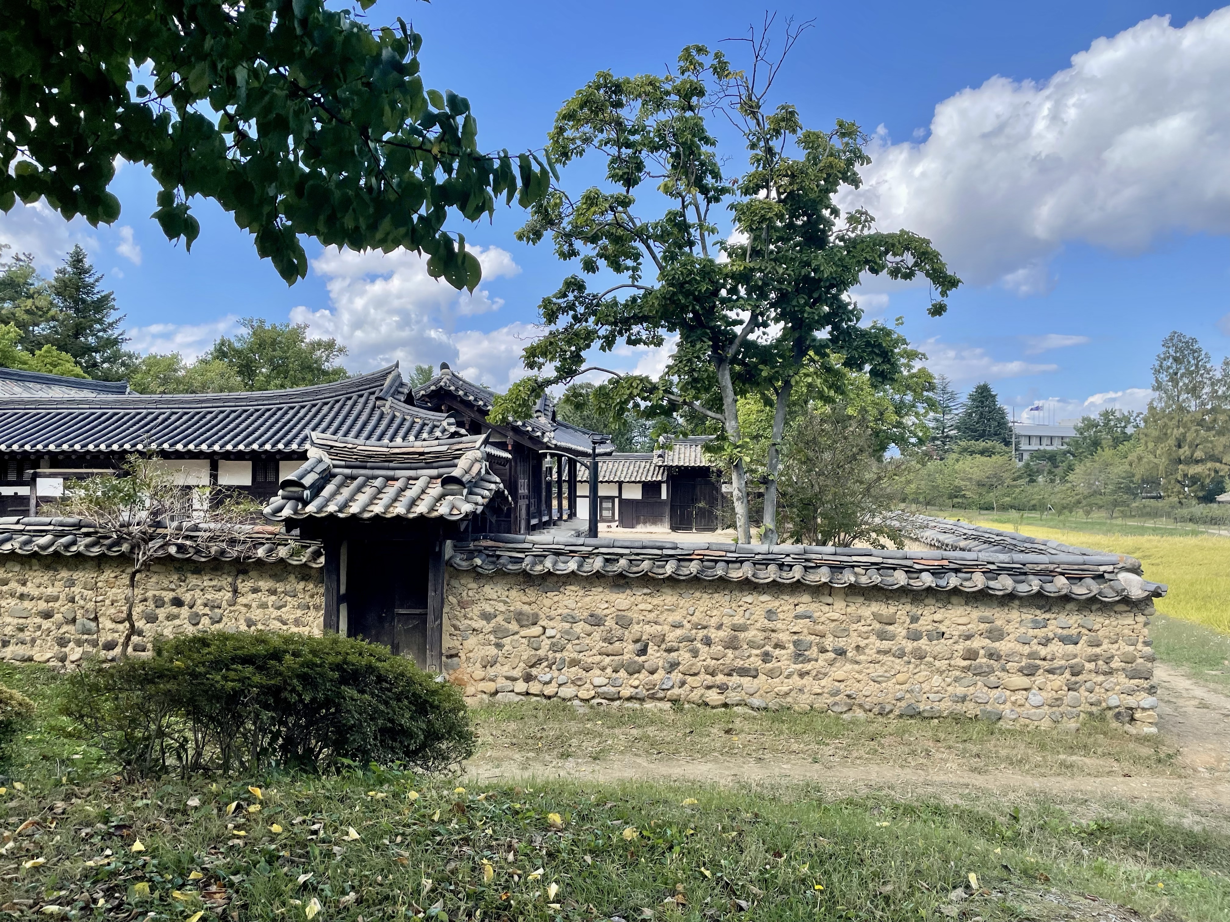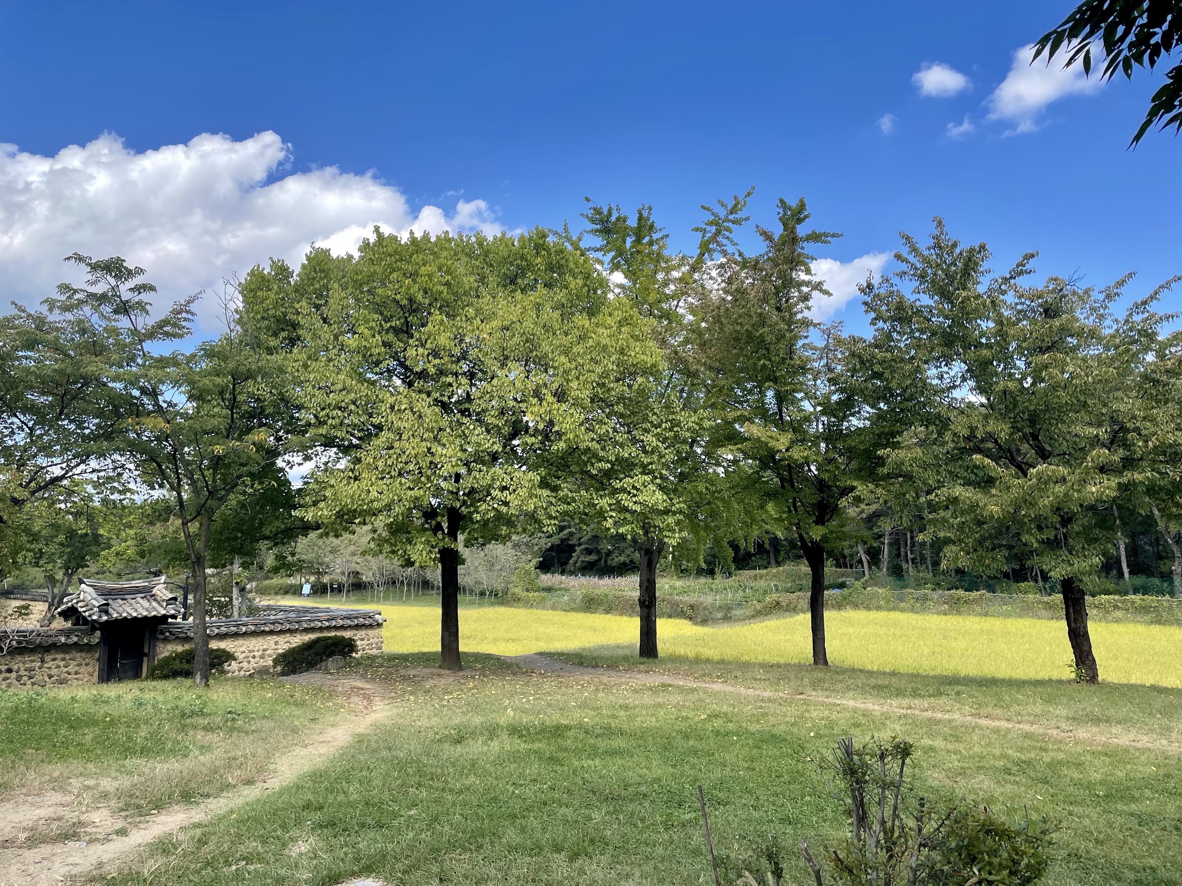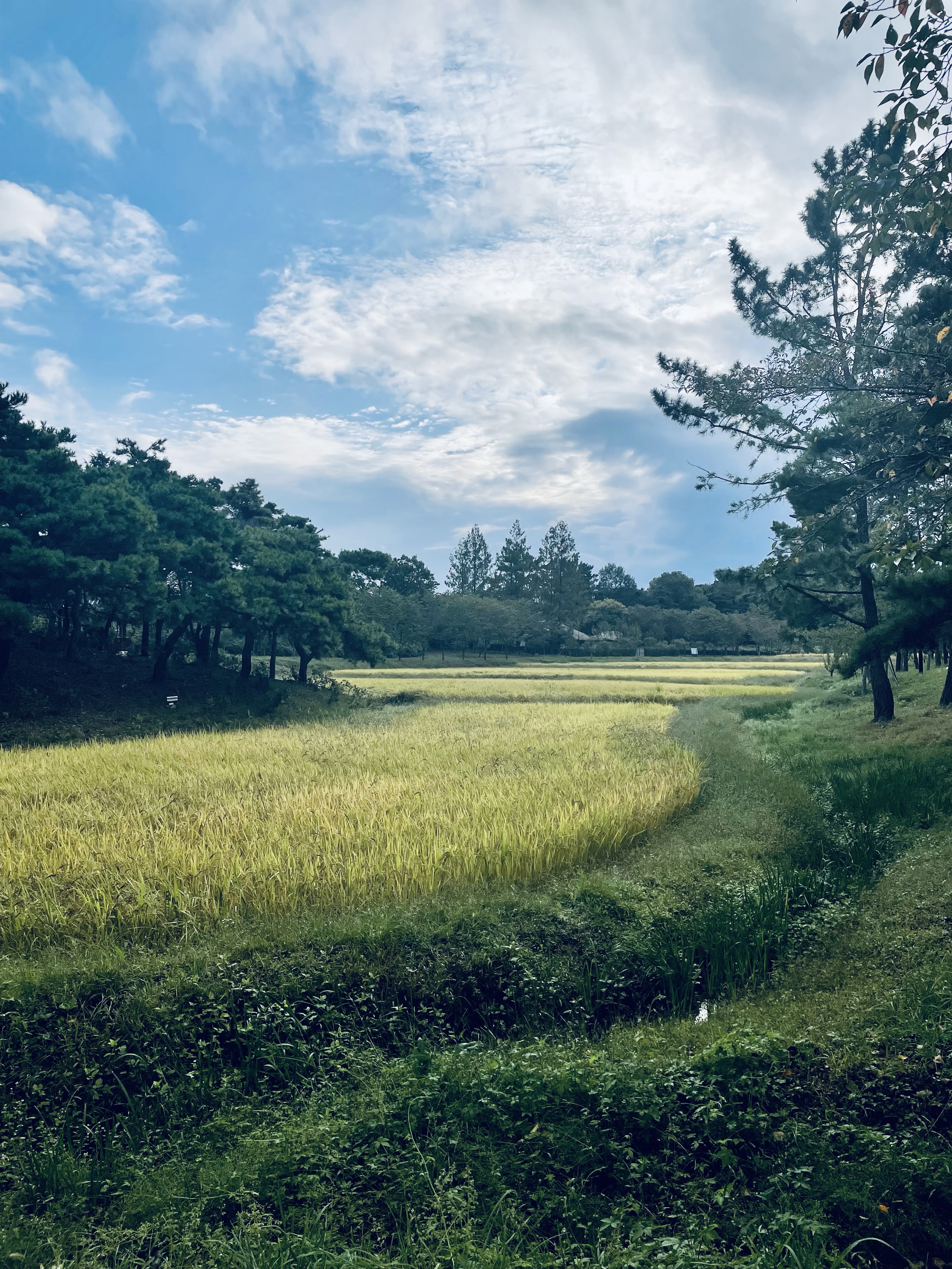 Just checking in with some photos of my recent walks in my neighborhood, plus a new shawl. The folk village is one of my favorite local walks in autumn. Every year the rice crop fades from vivid green to a stunning gold hue before it’s harvested, and it makes for a wonderful photo op. The sky seems a bit more vivid this time of year, too. I’m not sure why; maybe it’s the angle of the sun’s rays, or perhaps the more windy conditions clear the air pollution?