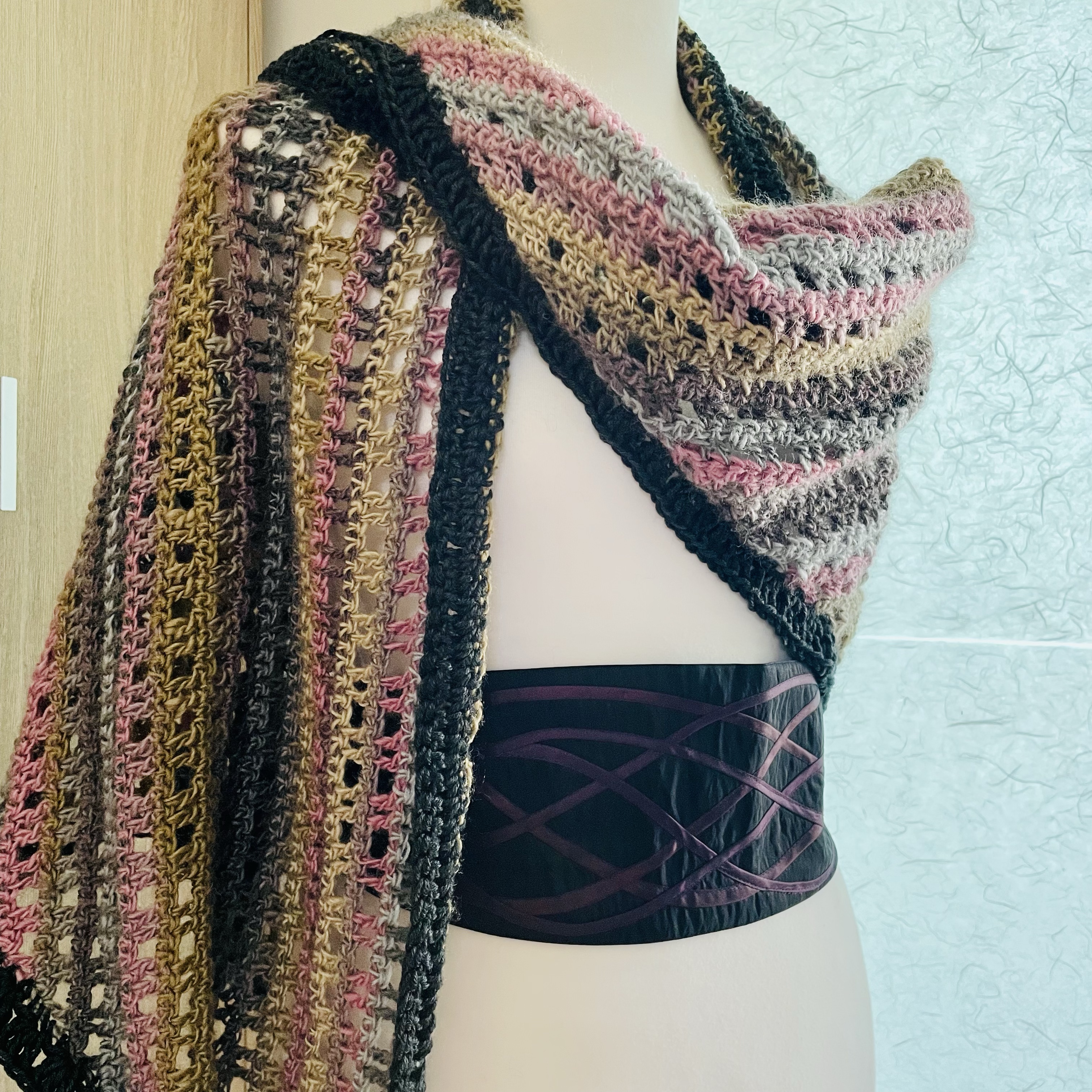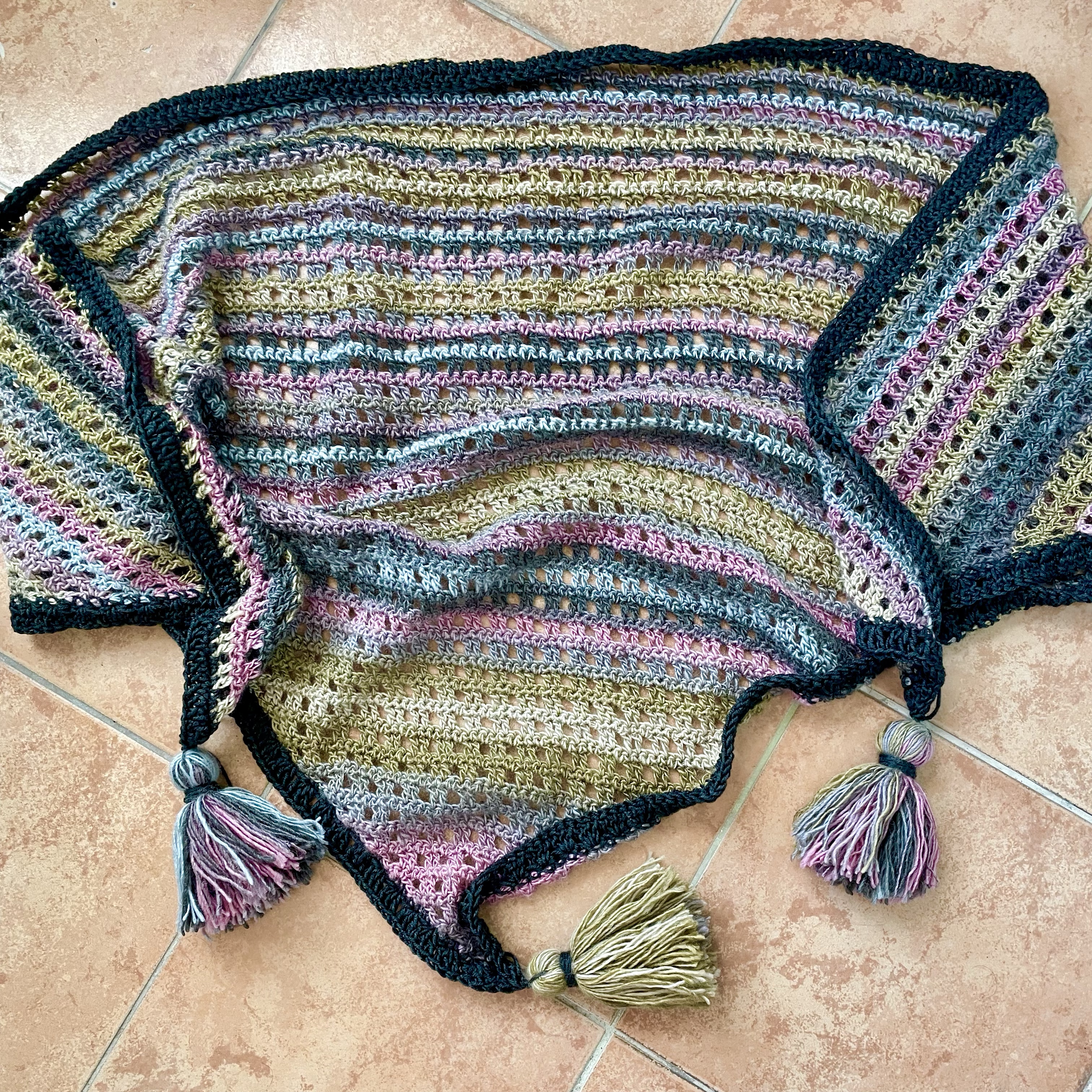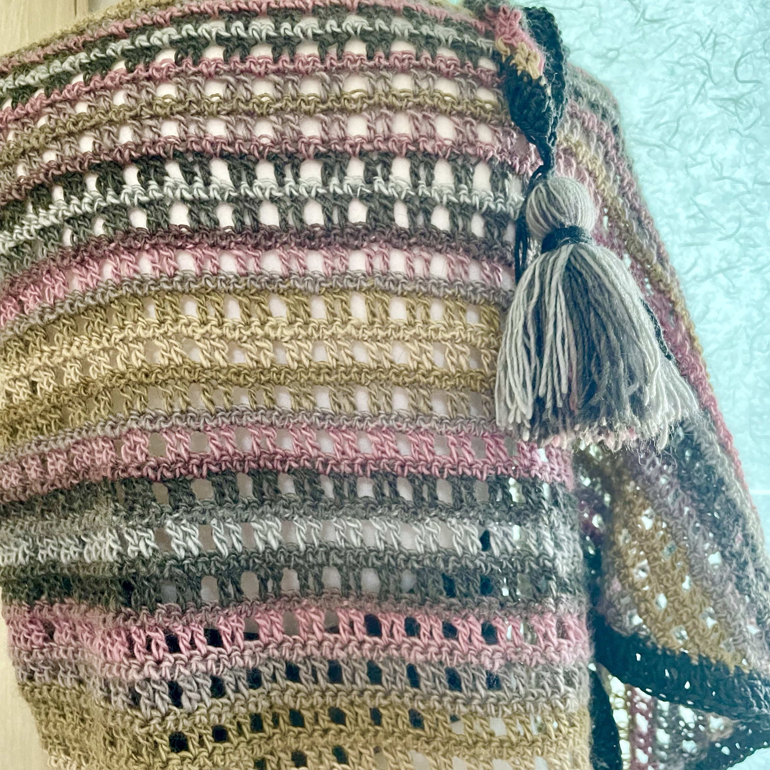 I just finished this easy shawl last night, and I love the colorway and the huge tassels. I used three skeins of King Cole Riot yarn in 3439 Sandstone, a mix of soft grays, gold, and pink. I edged the shawl with a darker charcoal gray wool yarn that I had in my stash. The stitches are single- and double-crochets in a simple open weave pattern. Tassels are of the Riot yarn, and I made them my favorite way – extra fat. For all, I used one of my Denise convertible hooks, size I – 5.5mm. I love making and wearing shawls during the colder months.