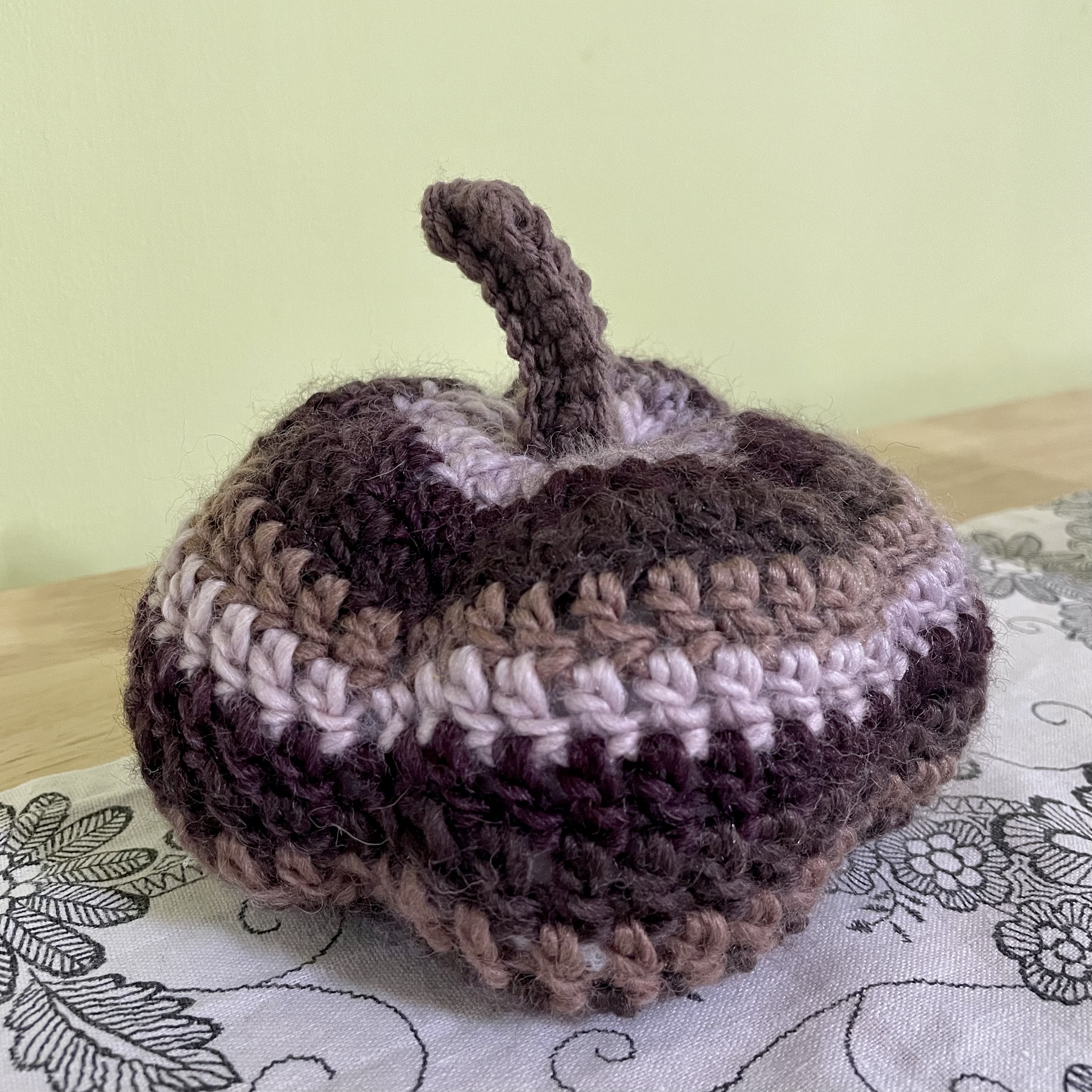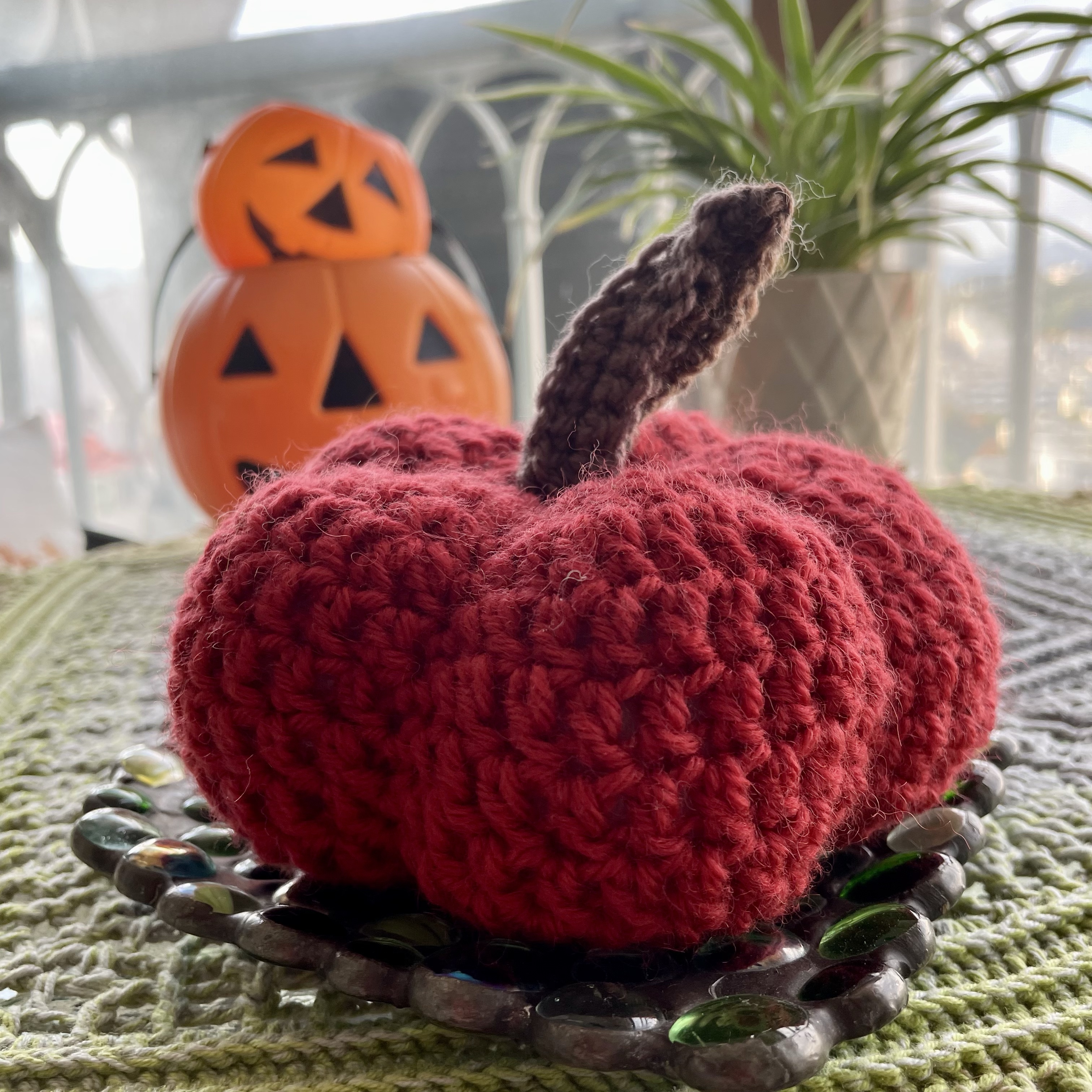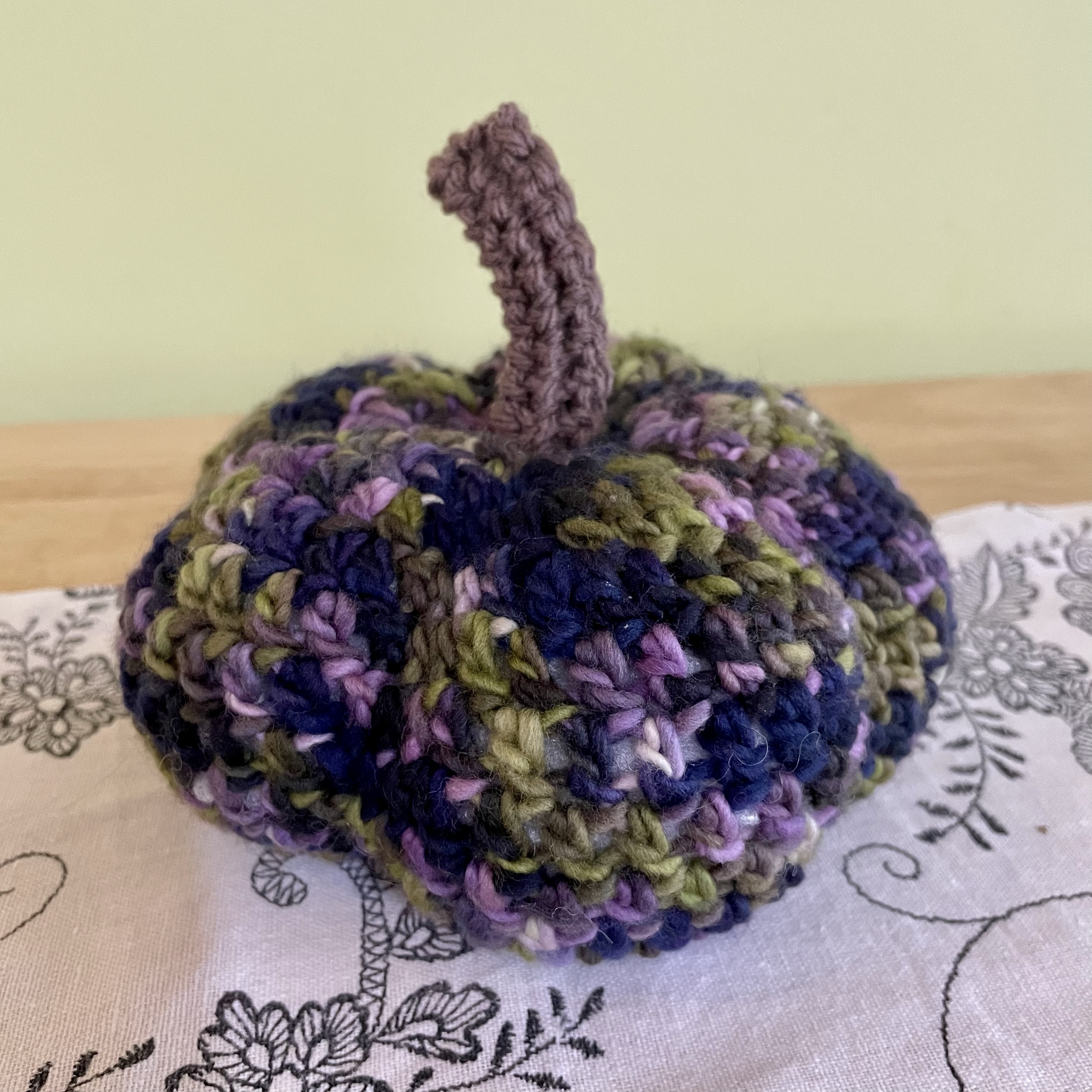 The pattern gives options to make a small, medium, or large pumpkin. I chose to make a few small ones, using scrap yarn in a variety of shades. I think non-traditional pumpkin colors are neat, and it’s a great way to use leftover yarn. A small pumpkin can be made in 30 minutes, if you are quick with a hook. It is 100% good for a beginner, too, as the pattern will let you practice single and double crochets, as well as increases and decreases.