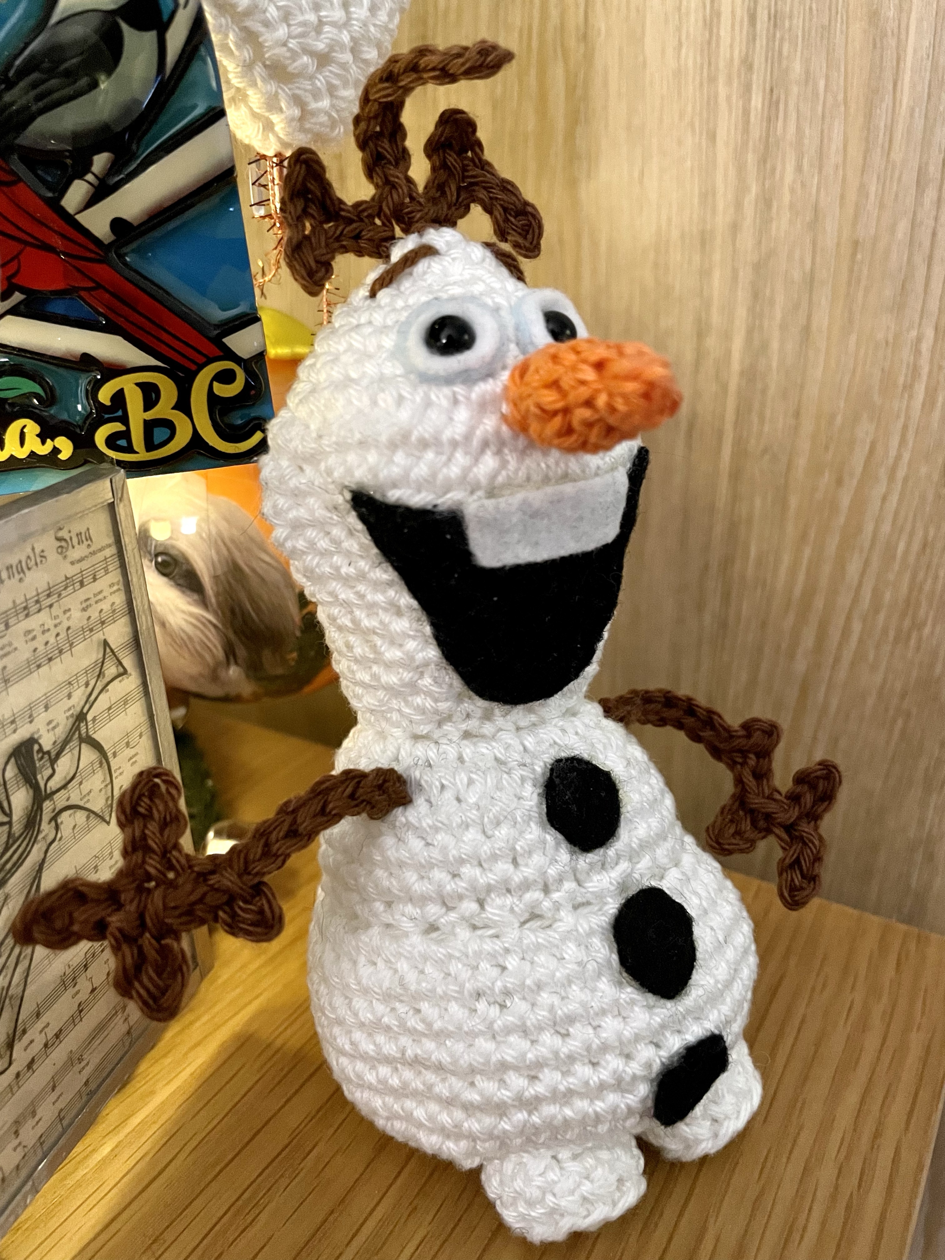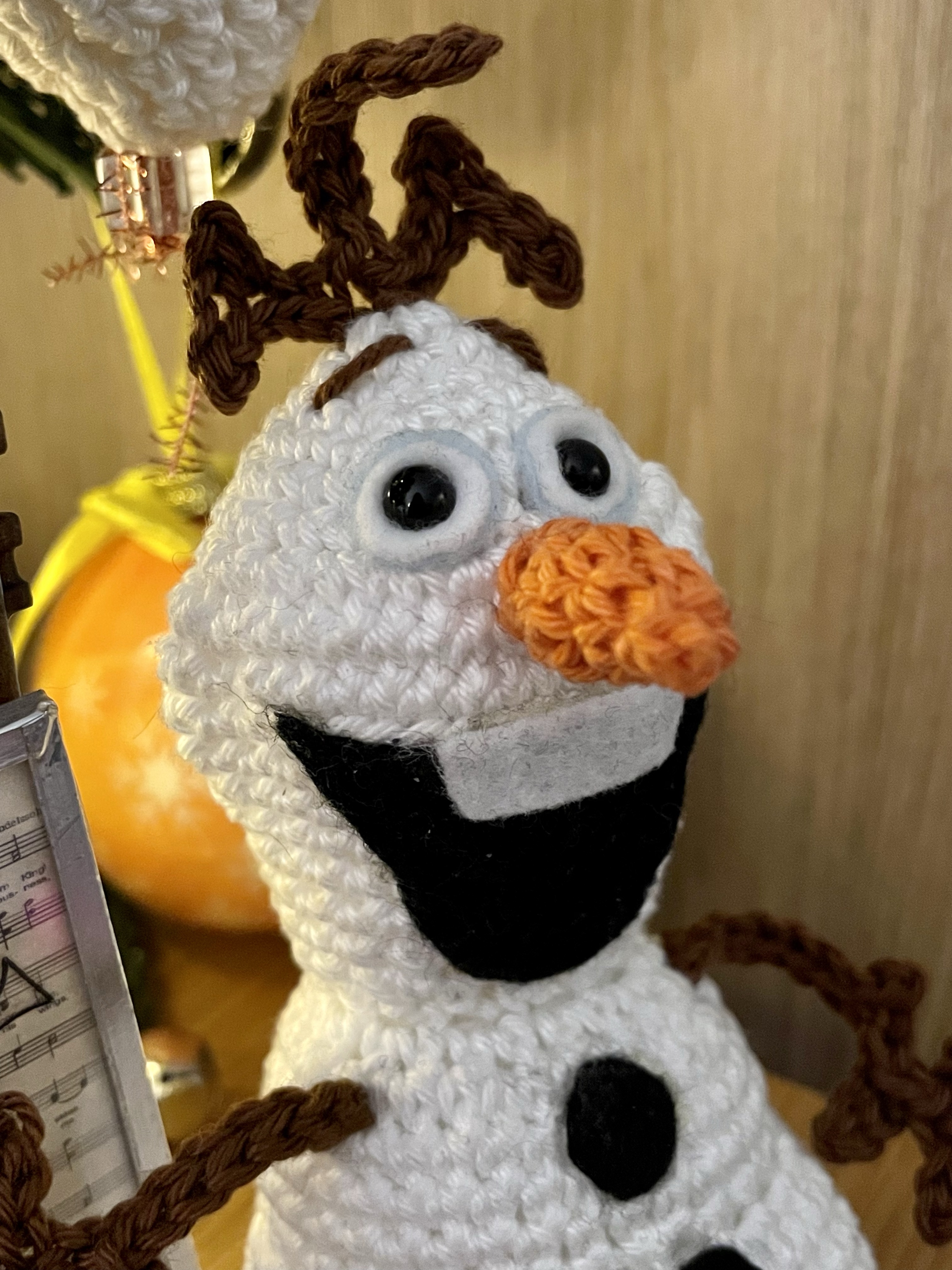 I finished this sweet amigurumi version of the character this evening. Olaf is only cooling his heels here for a bit, though, as he is earmarked for my youngest niece in California, where he’ll enjoy some of the best Summer weather on earth (Frozen fans know how Olaf loves all things Summer).
