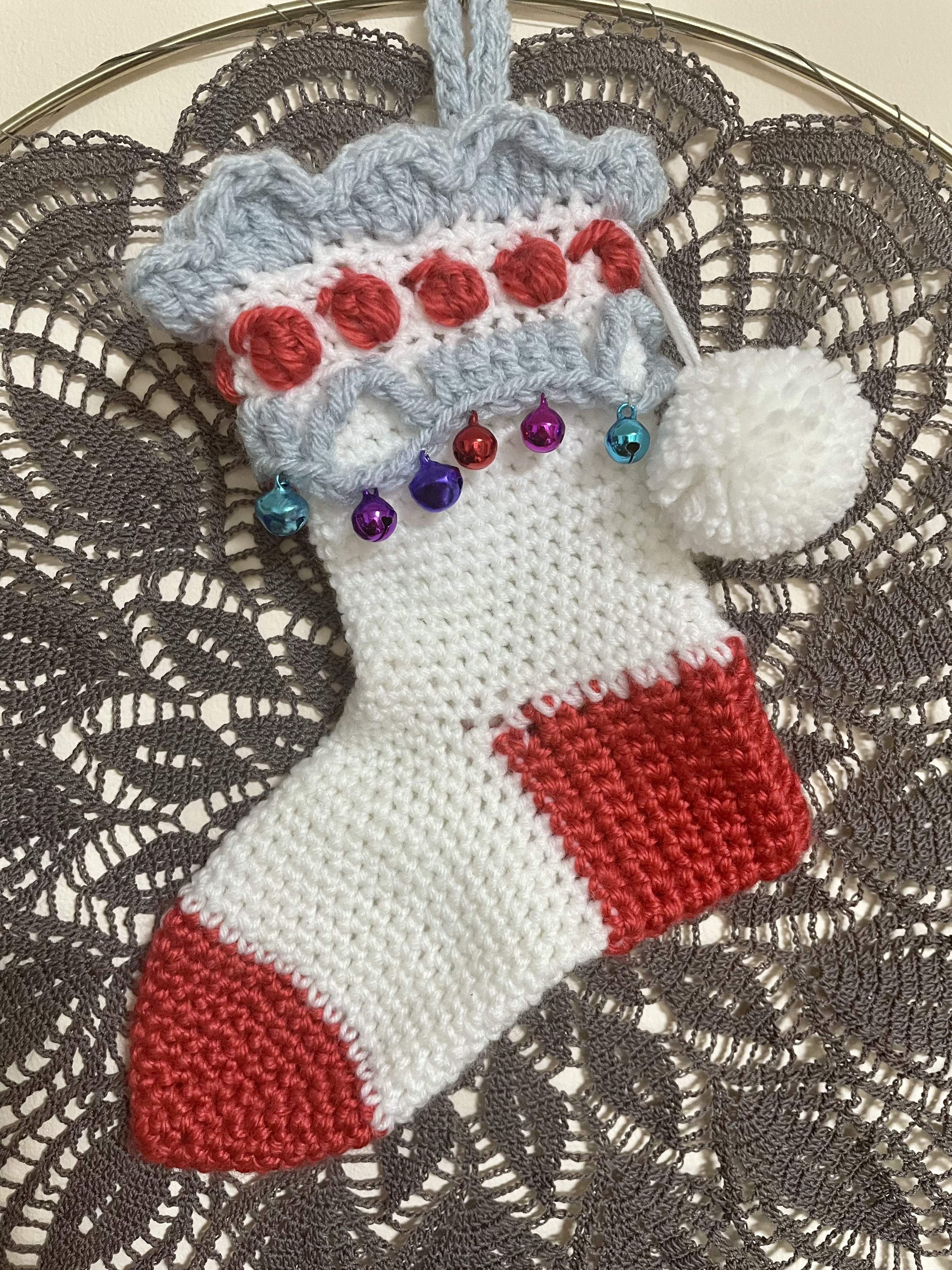 The fringe on the top half of the stocking is a good place to put bells or beads if so desired. I added some interesting glass beads in my craft stash that I bought long ago as part of a kit from Michael’s, and the tiny jingle bells (0.5 to 0.8cm) were purchased on Etsy.