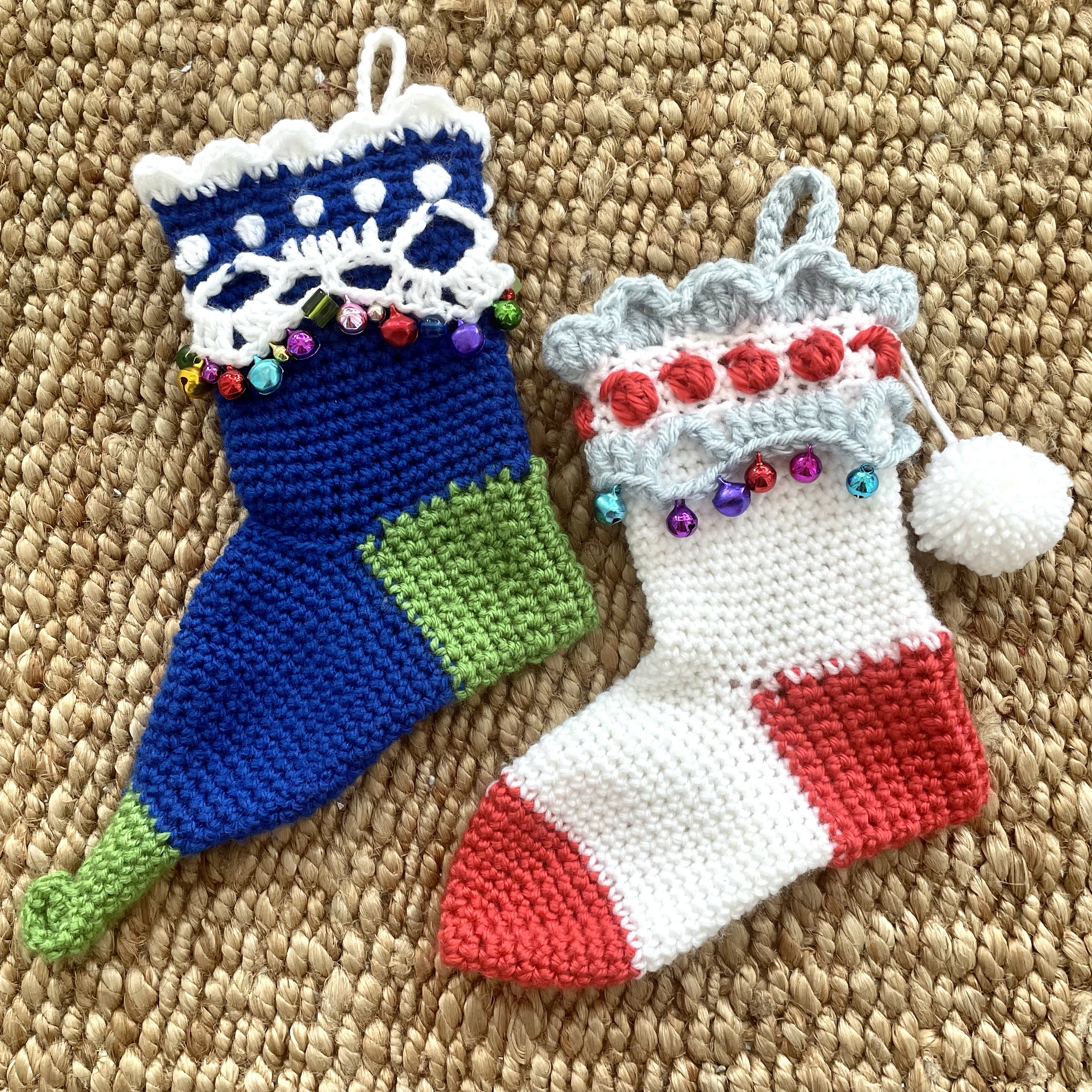 We are now officially ready for Santa here with my just-made Christmas stockings, from an adorable pattern by Gipsy Queen Von Tanja. The pattern has two versions, a classic sock shape, and an elf shape with a curled toe.