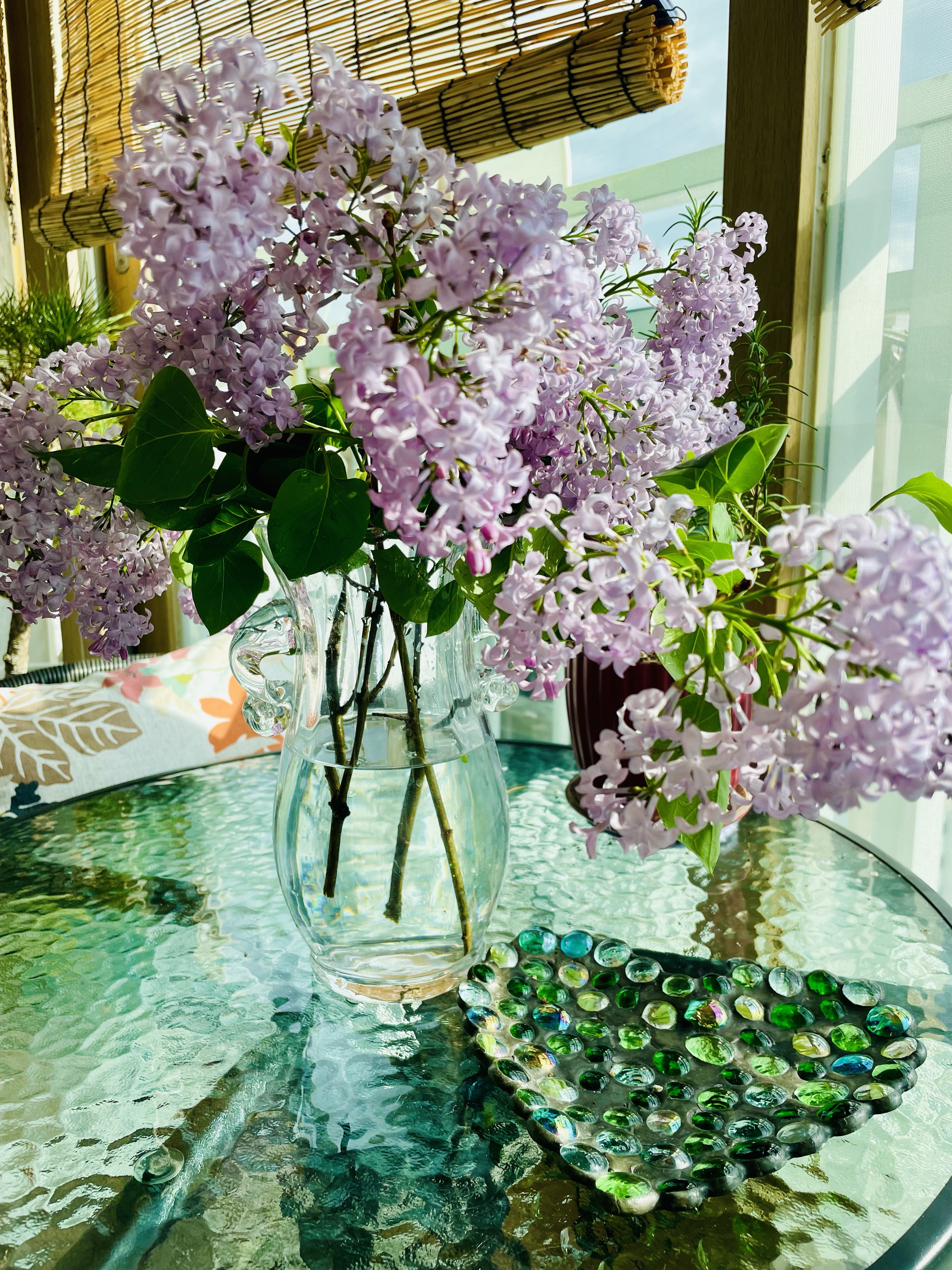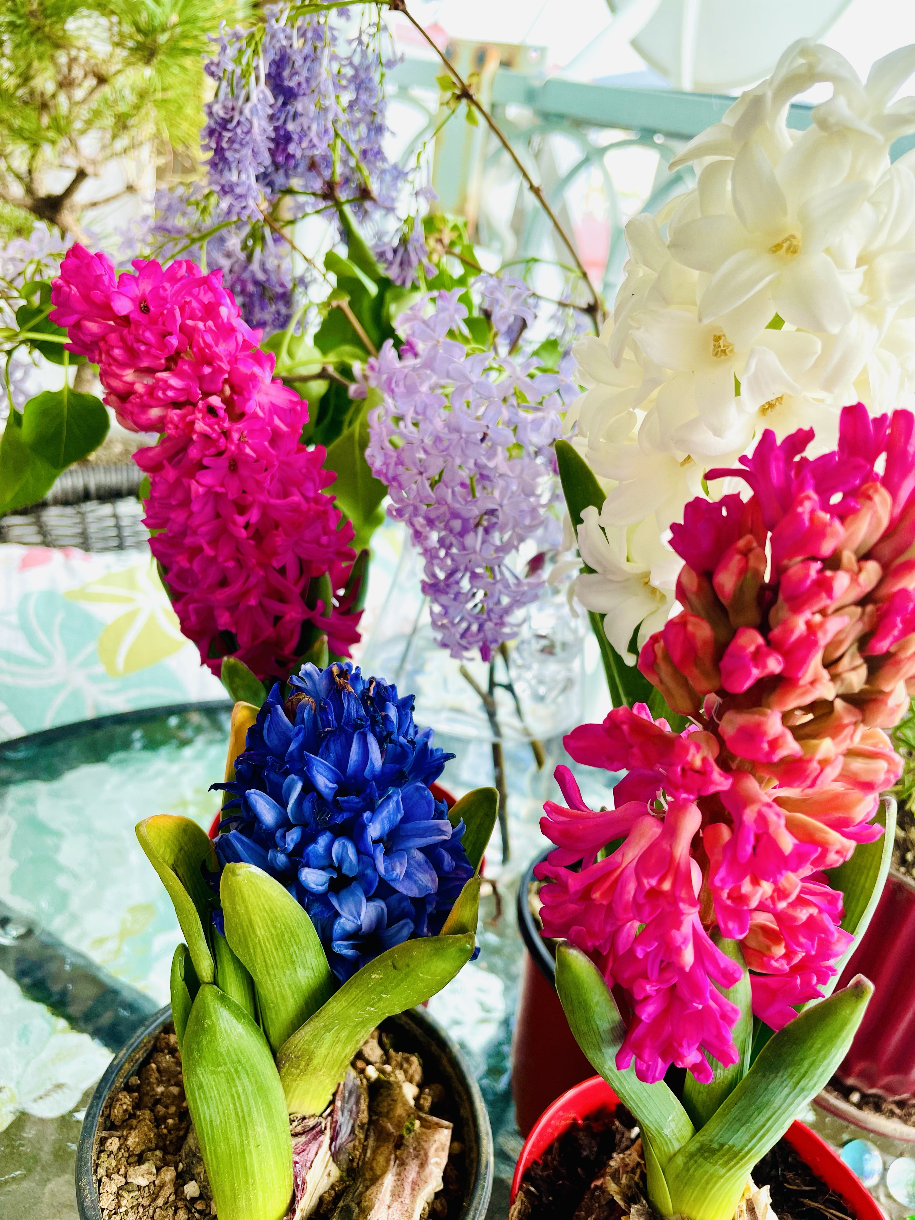 I’ll leave you with some sweet-smelling lilac blooms from my yearly haul. Lilacs are getting harder for me to find each year, for some reason, but I had success really close to home this time. I carry around clippers in my purse for all of April until I get them 🙂 I also share with you colorful hyacinth bulbs, another favorite this time of year.